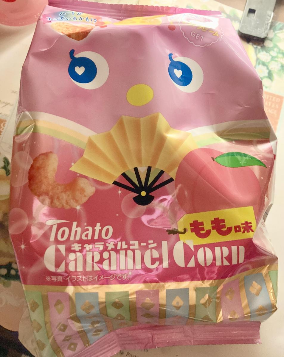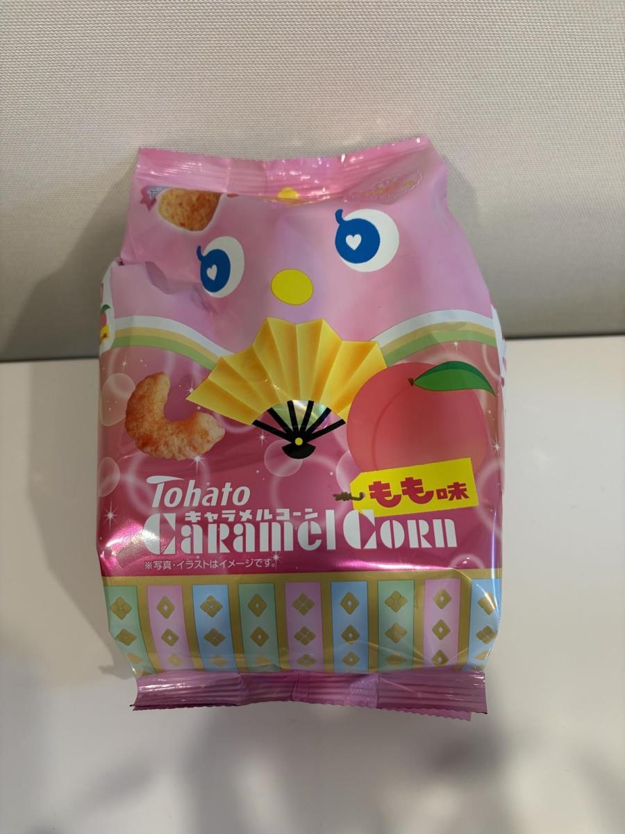 キャラメルコーンの軽い食感に甘い桃のフルーティなスナック♡