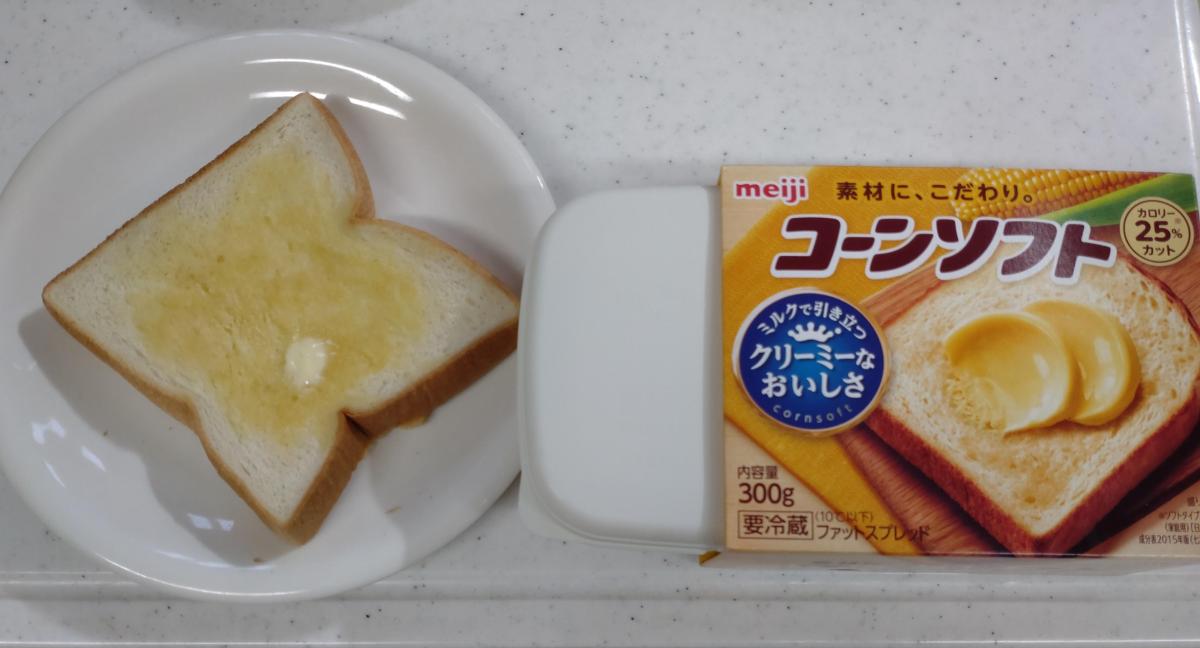コーンソフトはパンに塗りやすく、ミルクの旨味、コク、塩味のバランスがとても良いと思います。パンに隙間なく塗ってからトースターで焼くと、マーガリンが染みて美味しいですし、トーストしてからパンに塗っても、溶けてない部分があるのもまた美味しく、それでいて塩分25%カットと言うのも嬉しいです。