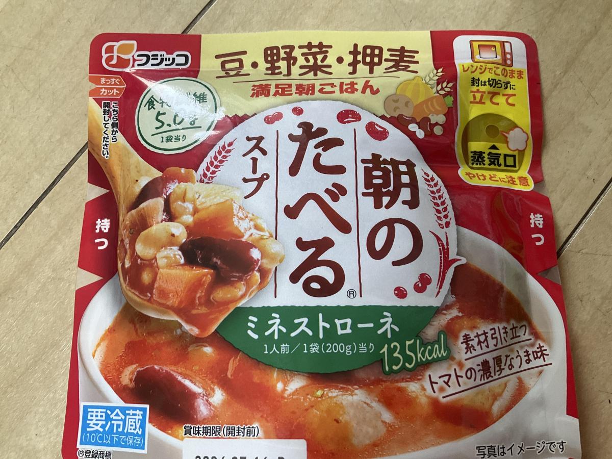 最近とてもはまっている、フジッコさんの朝の食べるスープのシリーズです。トマト味のものは、スープとしてはあまり最近食べていなかったので、ちょっと食べてみたくなり、ミネストローネを選びました。