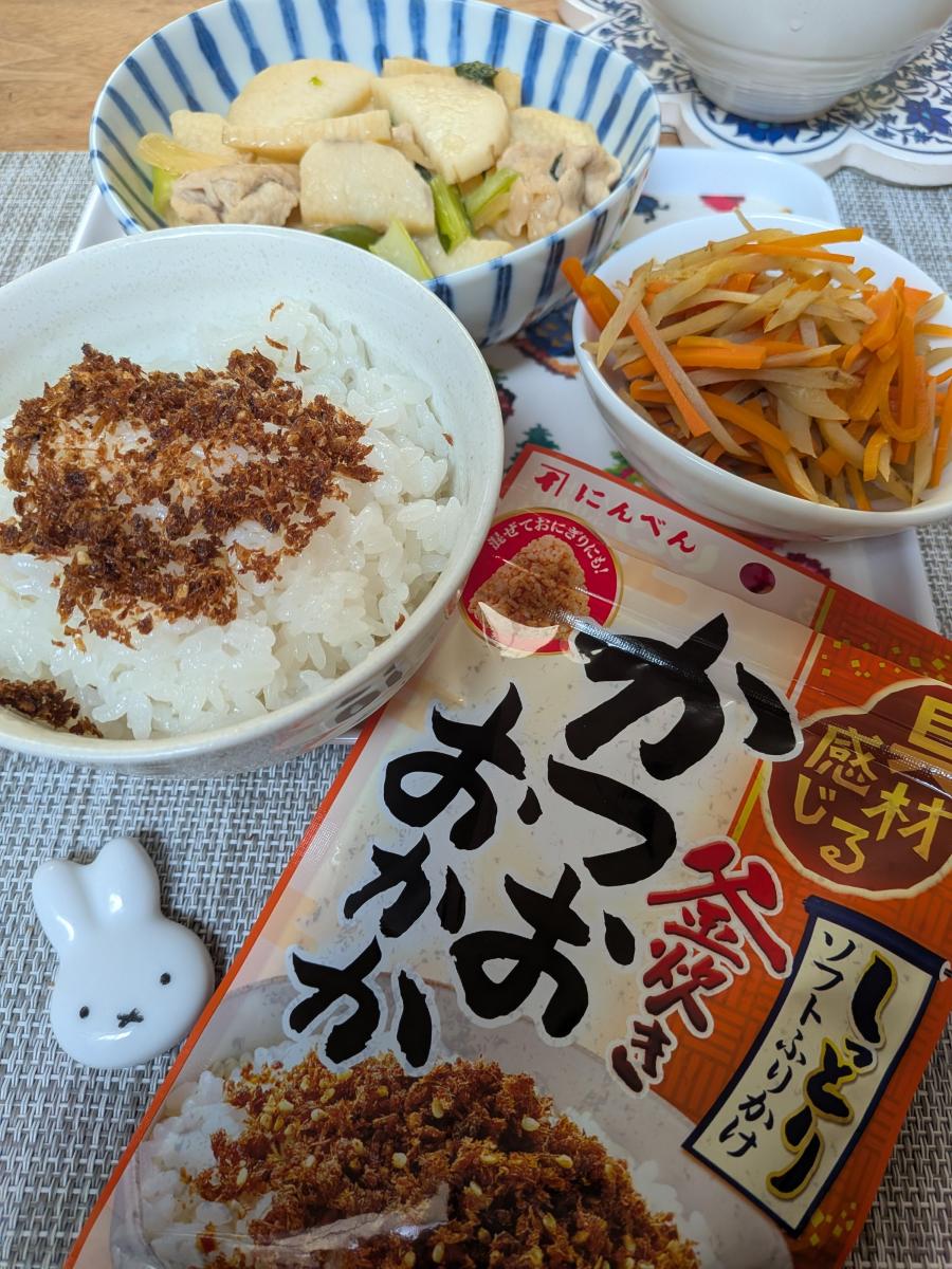 自分で鰹節に醤油をたらしてアレコレするのは面倒なので、ソフトタイプのふりかけは常備しておくと便利ですね。