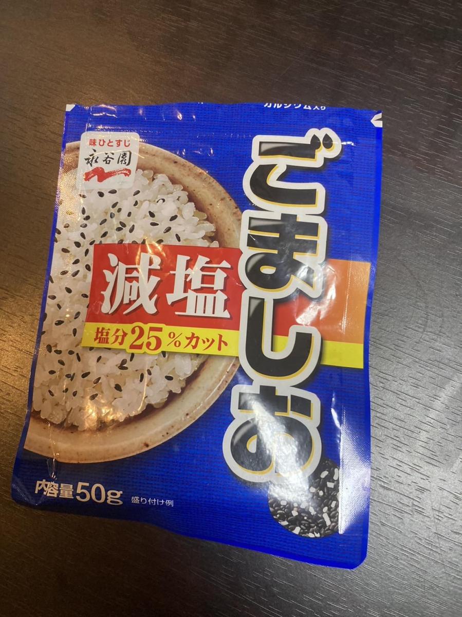 通常のごましおに比べてナトリウム25%カットの【減塩ごましお】お弁当のご飯にふりかけがない時にかけたりしてます。減塩だけど、ちゃんと塩味感じて美味しかったです。