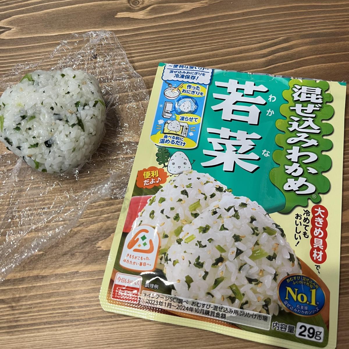 混ぜ込みわかめシリーズの中で一番好きな具材です。大きくカットされた大根若菜のシャキシャキ食感と、わかめの塩味と旨味、そして白煎り胡麻の香ばしさが加わって冷めても美味しさが続きます。混ぜ込みわかめは、通常のふりかけよりも味がしっかり付いているので、和え物やパスタとごはん以外の様々な料理に使えるので重宝します。冷めたごはんでも混ぜ合わせやすいので、若菜の食感を楽しむなら断然おむすびがオススメです!