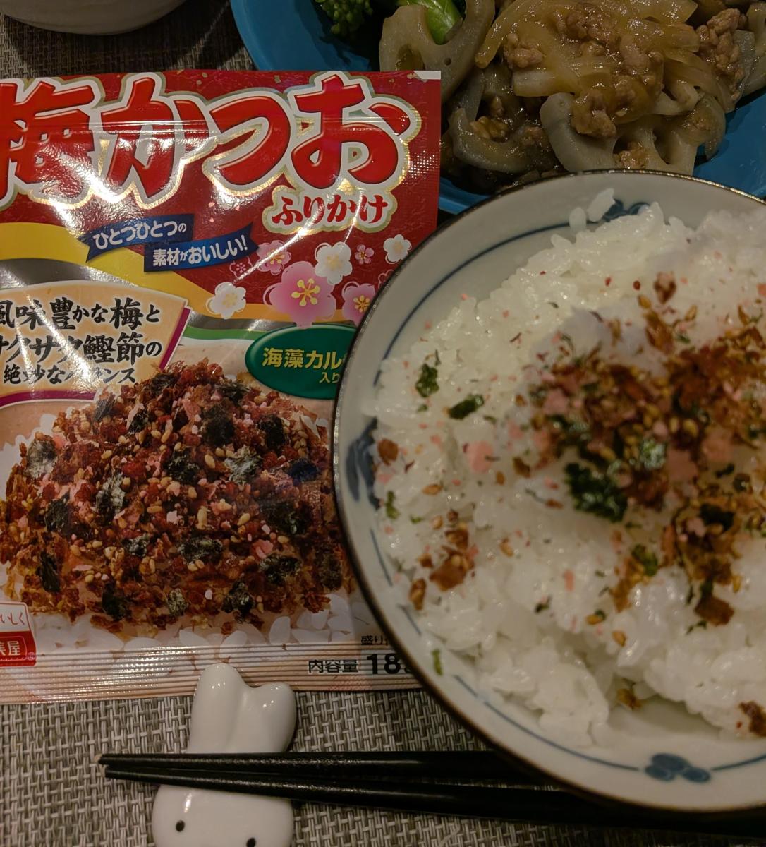子供の頃から、カツオ味は好きだったが、梅と合わさる事で白ご飯が更に旨いッッ。お新香、味噌汁と、コレだけで充分豪華なご飯になる。何なら、お新香、味噌汁無くても。仕事のお弁当自分の分だけの時に、タッパーに、ご飯と漬物、ある時は前日の残り物をのせ、お気に入りのマイカップとインスタント味噌汁、そして、ふりかけを、お弁当ポーチに詰めつめ。コレだけでしっかりお弁当にもなって楽ちんです。一人の時ご飯作るのめんどい時にも、旦那様のお弁当のおにぎりにも。と〜っても助かります。カルシウム取れるし、シリーズ沢山あるから良いですね。