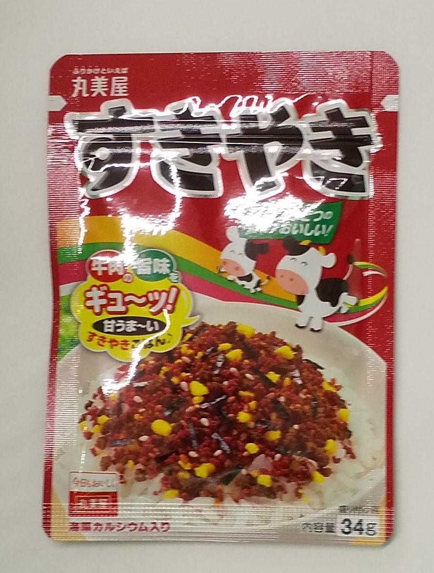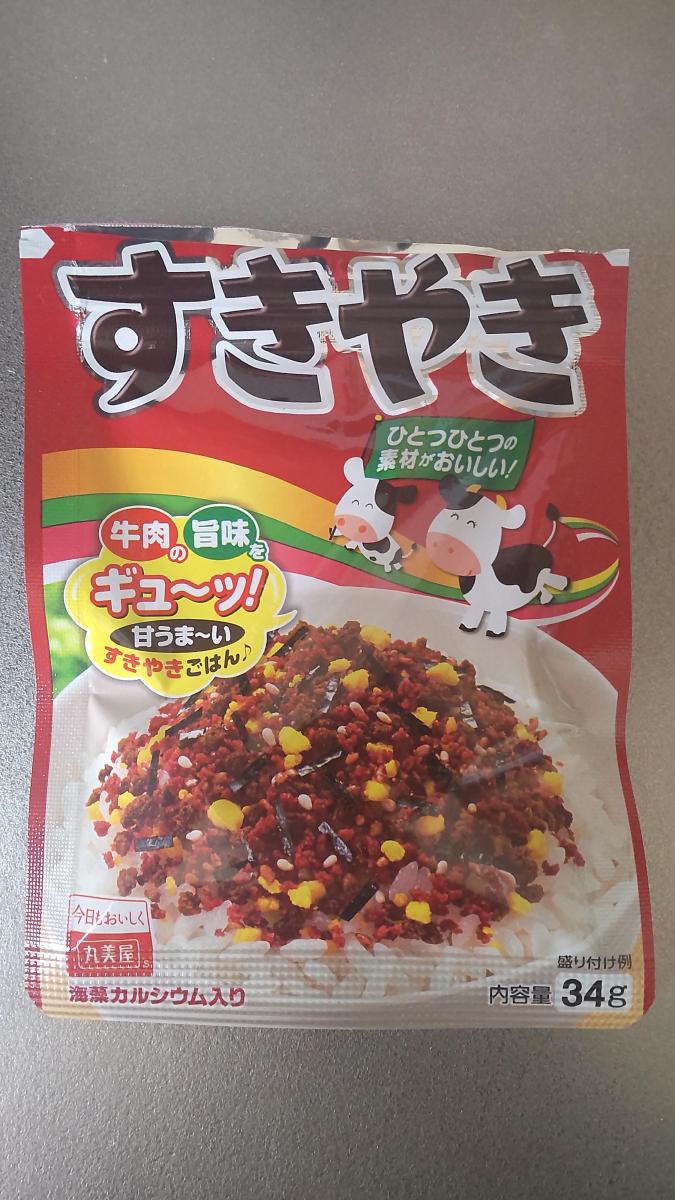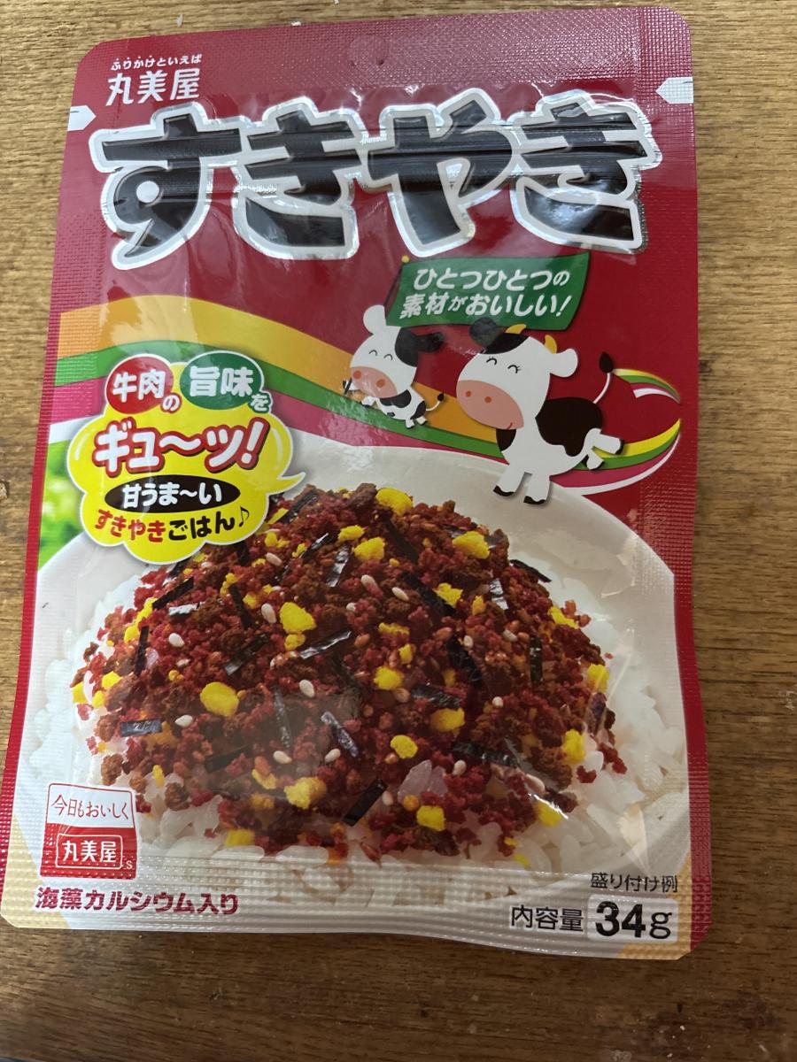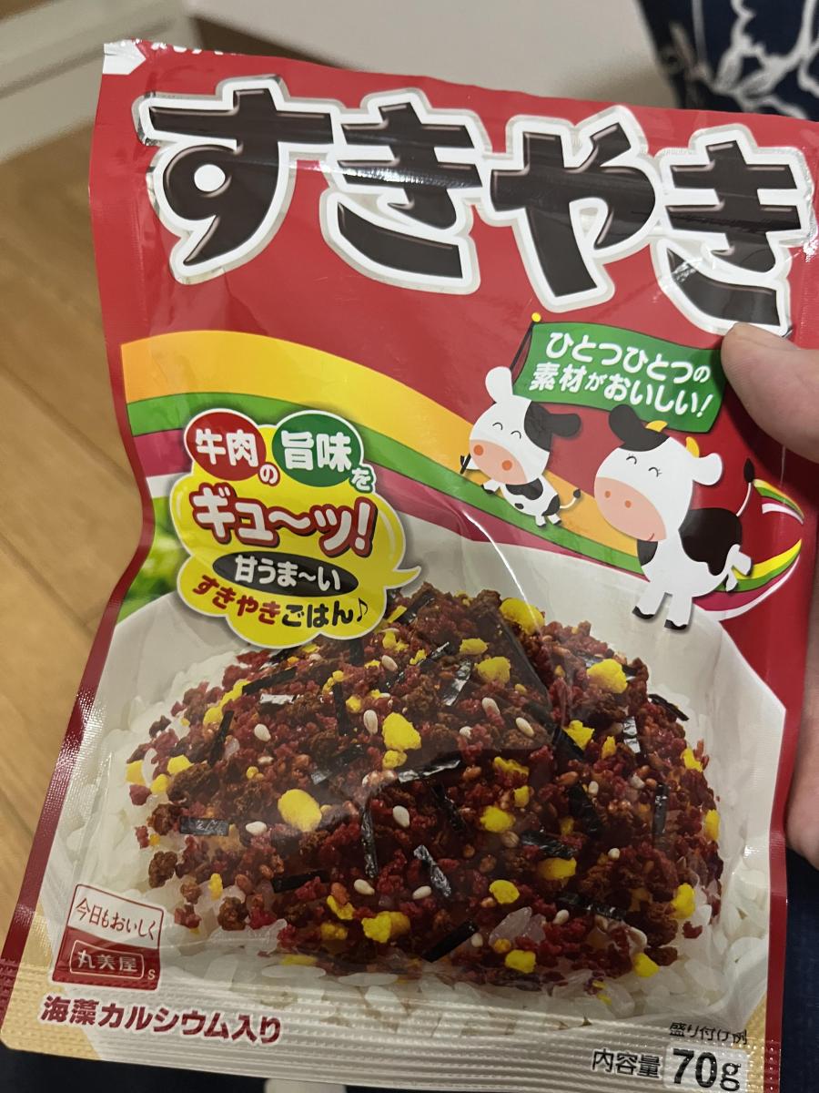 すき焼きふりかけは甘くて牛肉の香りがしてご飯にとても合います。ところどころに入ってる黄色の卵のような物が彩りをよくしてくれてます。ご飯が何杯でもいけちゃいます。