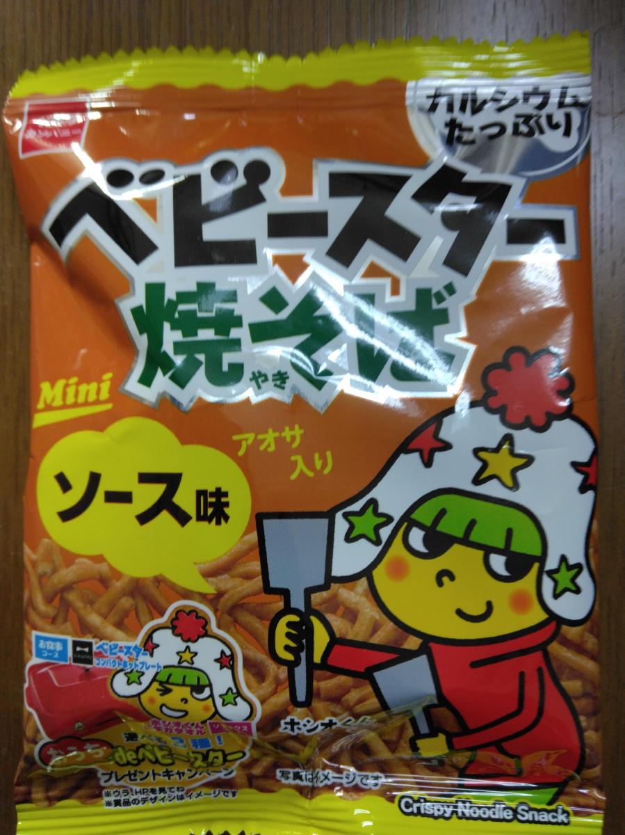 ベビースター、おやつに、おつまみに、最強のコスパお菓子ですが、ソース焼そば味もいけてます!アオサ入りでカルシウムたっぷりなのもよしです!