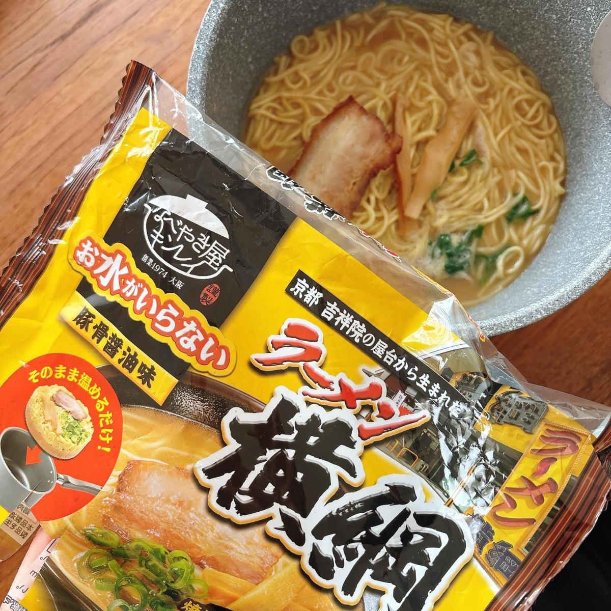 お水がいらないため鍋に入れて温めると出来る時短調理が良い所。味付けは豚骨醤油で濃厚なスープ。太縮れ麺に絡みクセになる美味しさです。