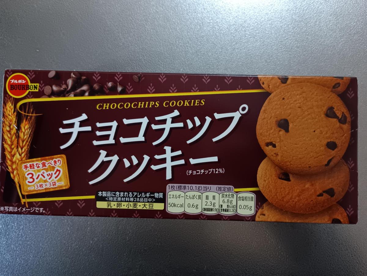 生地とチョコチップは若干歯ごたえがあり、チョコチップは適度に入っており、美味しいです。枚数が少ないですが、ワンコインちょっとで買えるのでまだいいかなと思いました。