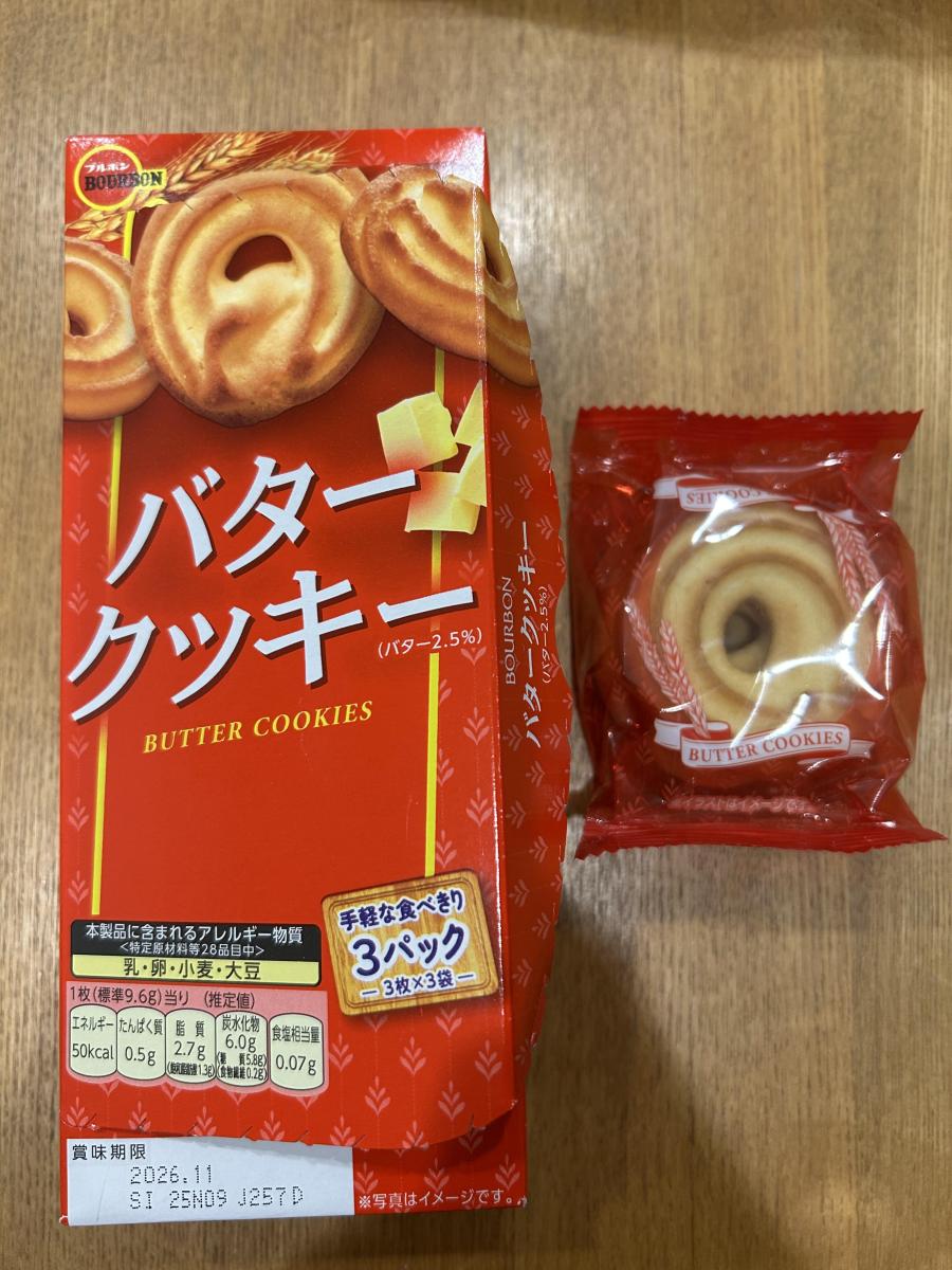 100円くらいでいつも売っているのを見かけます。クッキーを買いたい時はバター入りが美味しいので、よく選ぶクッキーの一つです。3パック小分けになっているので、開封による湿気の心配がないのも良いです。
