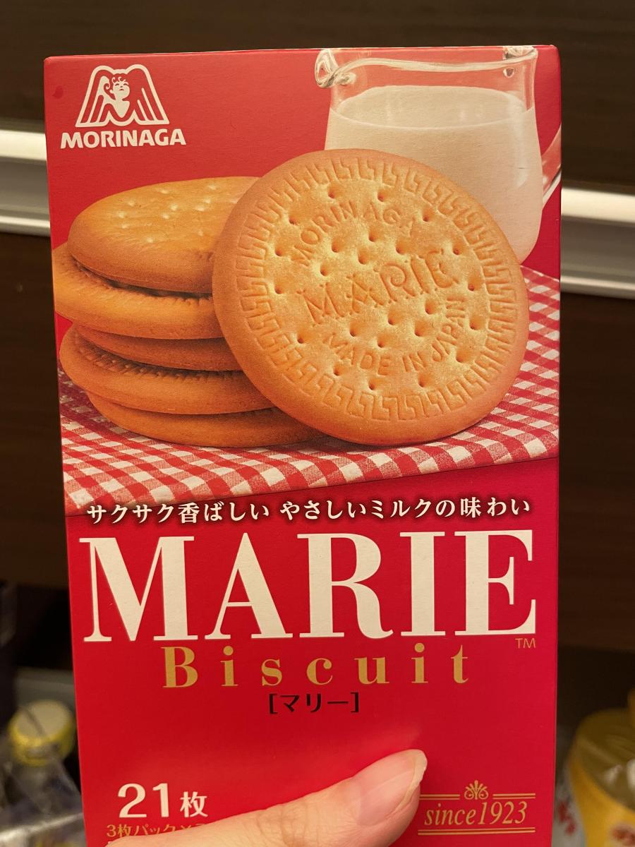 昔からあるマリー。久しぶりに食べたけど変わらない味でした、素朴なビスケットです。そのままでもいいけど、アイスや、生クリームをはさむと何倍も美味しくなります。ジャムをつけても美味しいー。おやつや朝食代わりに重宝します。
