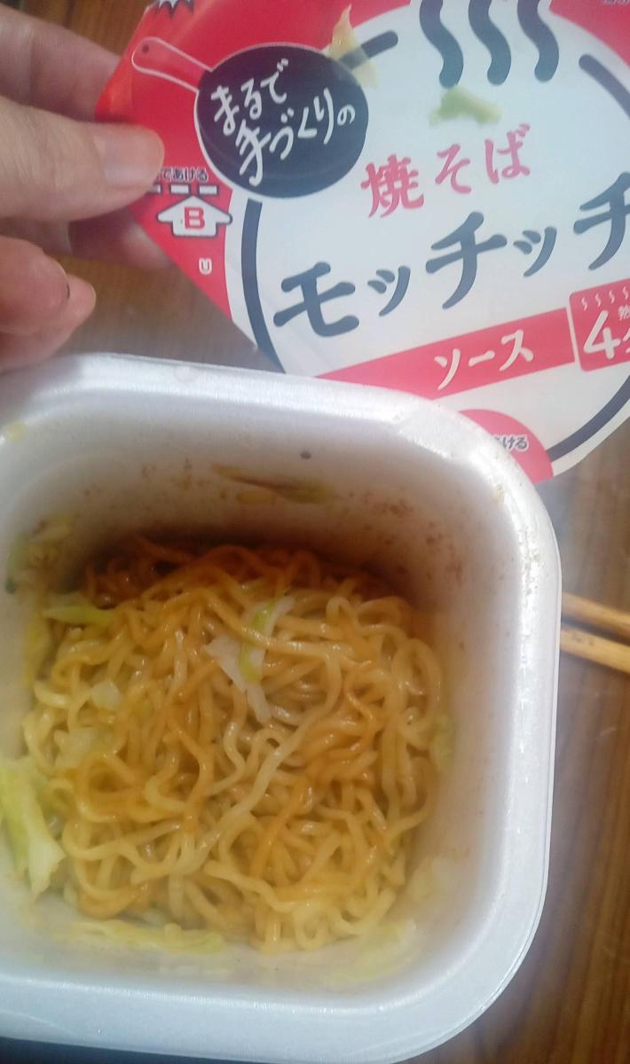 普通のインスタント麺と思って食べてみるとびっくりしますよ本当にもちもちしていますよ。そして四角い縦型容器なので食べやすいですね具はシンプルにキャベツだけでした。ただソースがあっさりした感じで濃い味を求めてる人には物足りなく感じると思います。