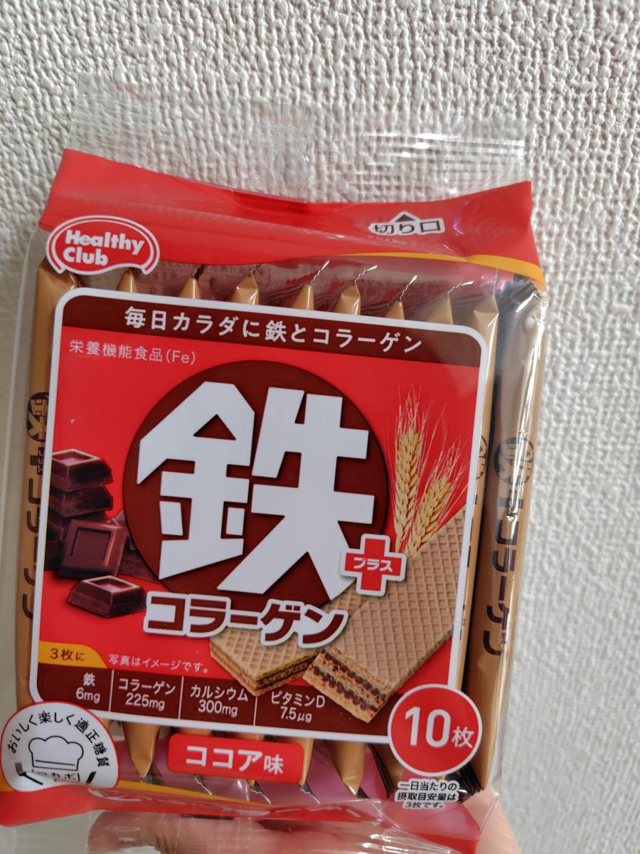 ドラッグストアやスーパーでよく見かけ、おやつなどにちょうど良いため購入しています。ほのかな苦味のあるココア味の薄めなウエハース、ココアクリームがサンドされています。1日あたり、3枚で1日分の鉄分が補え、さらにコラーゲン入りで嬉しい商品です。