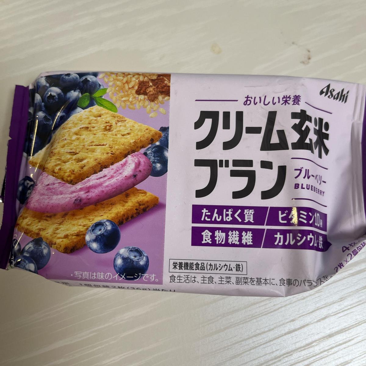 クリーム玄米ブランシリーズのブルーベリー味です。噛み応えのある、硬めの玄米ブランの生地にブルーベリー味のクリームがサンドされています。玄米の香ばしさや歯ごたえもあり、腹持ちも良いです。2枚でカルシウムビタミン、食物繊維などの栄養素も手軽に摂取できるのが嬉しいです。