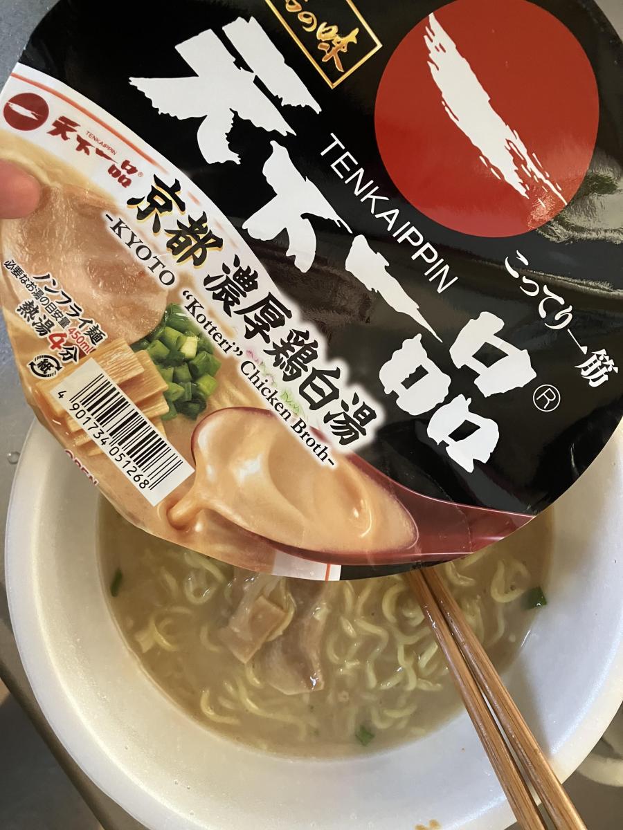 天下一品の鶏白湯が好きなので、カップ麺の味を確かめたくなりました。かやく以外はお湯を注いだ後にいれないと麺がほぐれません。スープは少しとろみがあります。飲んでみて、ちょっと塩気が強く感じました。しょうゆが濃いというか、鶏の甘みを感じたかったのでちょっと残念でした。麺はつるっとしていて、喉ごしが良いです。具材としては、メンマはコリッとした硬めの食感で、チャーシューはやわらかくておいしかったです。正直言ってもっと食べたい!笑 でも冷凍の「お水のいらない天下一品」の方がしょっぱさは控えめで、お店に近い味に感じました。次にまた買うなら冷凍の方にします。