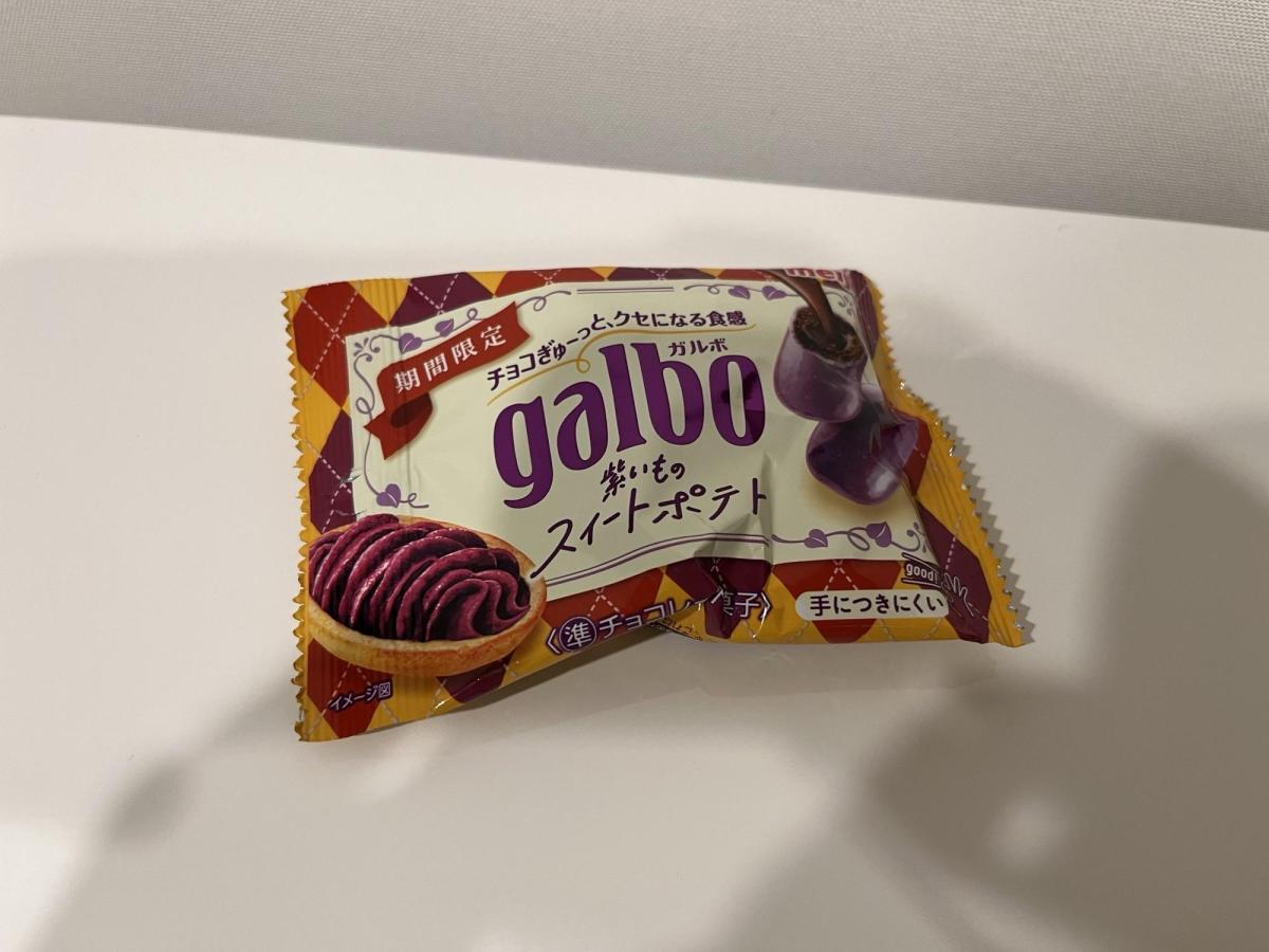 あまり食欲をそそらない紫色のガルボ。食べてみるとガルボなのでおいしいのですが、スイートポテト感はほぼありません。でもそこにこだわらなければよくできたチョコレート菓子です。