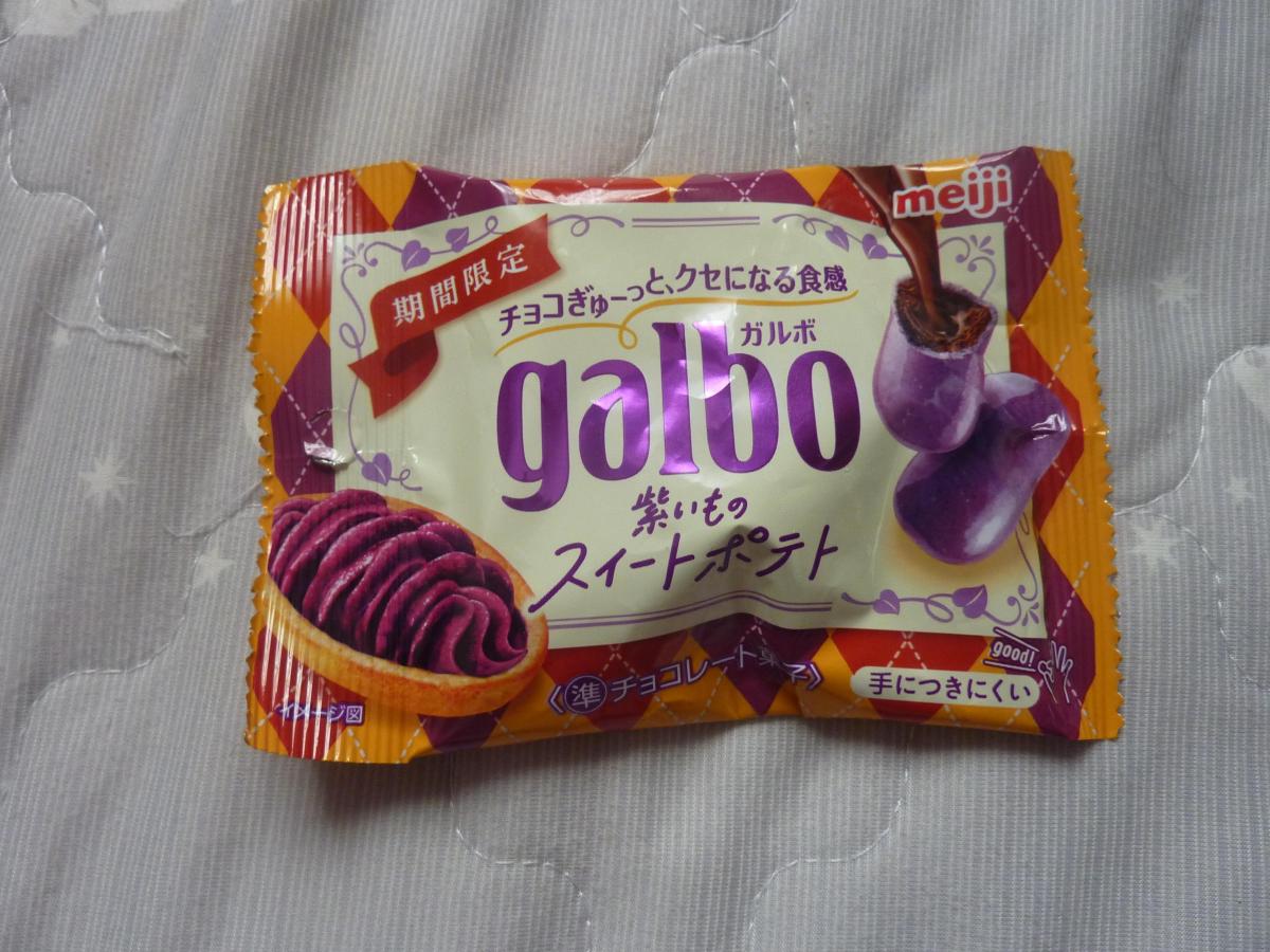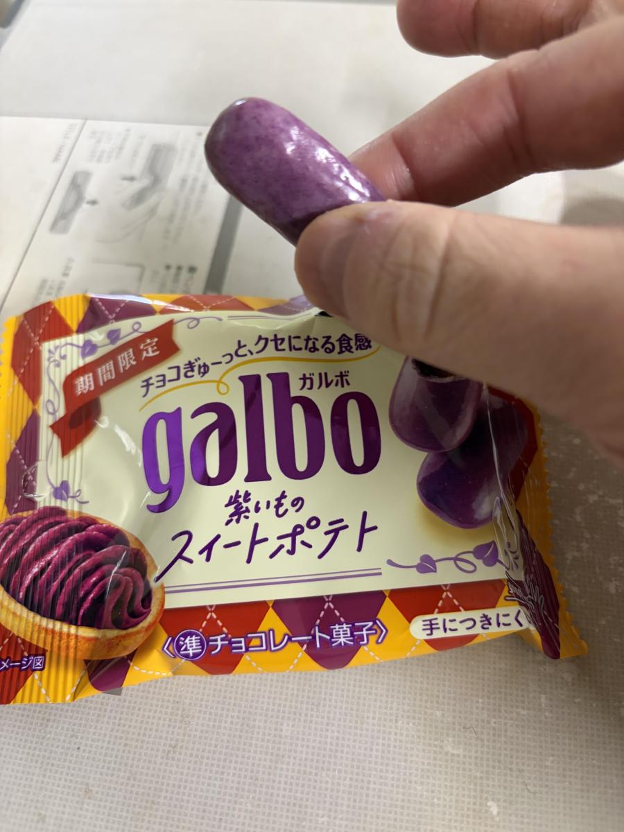 ガルボ大好きで今回紫いもだったので気になり購入してみました。袋から出すと鮮やかな紫色のガルボが出てきました。表面はつやつやで手につかないので食べやすいです。おいもはほぼ香りのみで、チョコやカカオ感が強めでがっかりでした。もっといもの味わい感がほしかったかな。コスパはいいので食べやすいです。