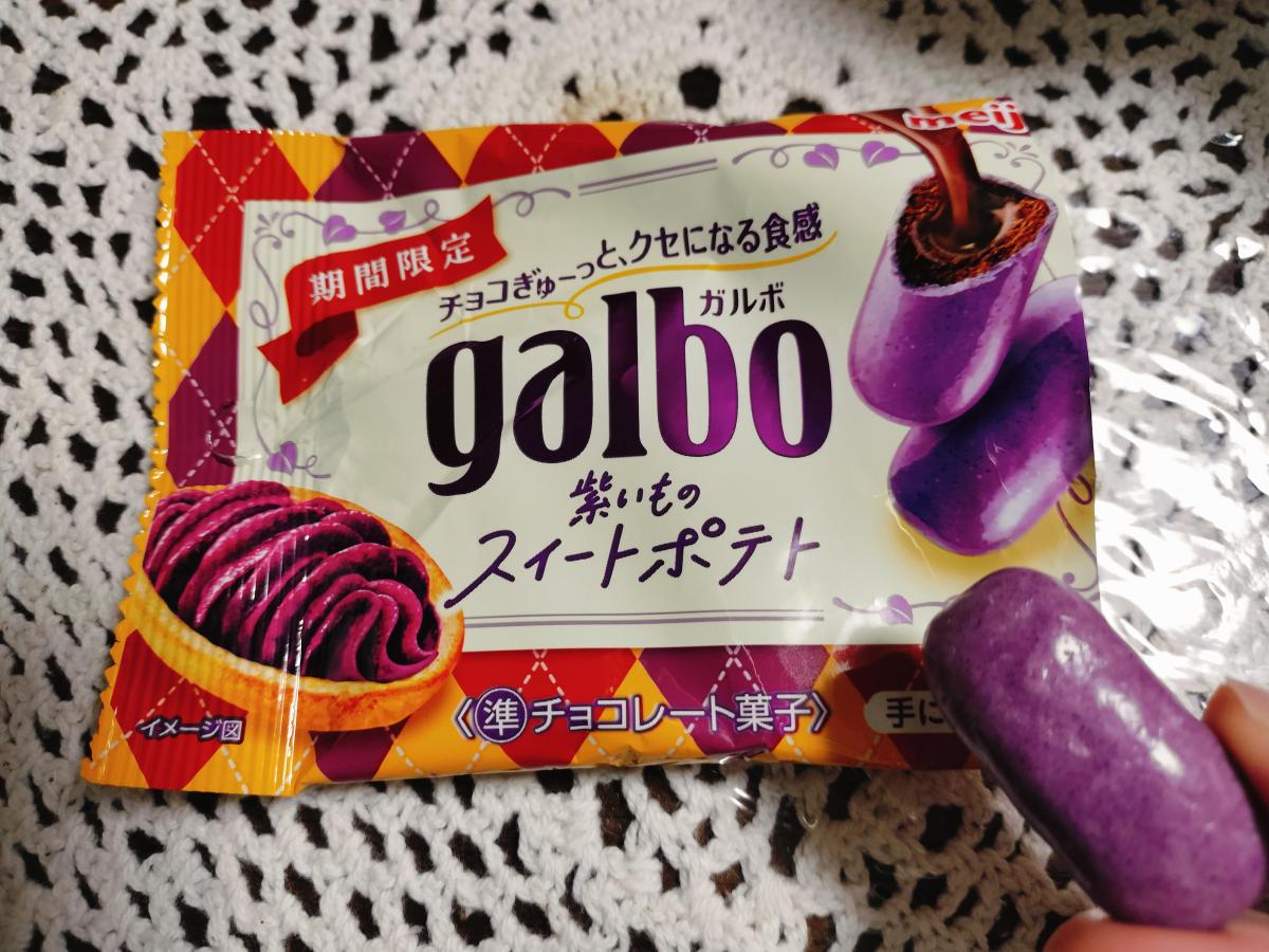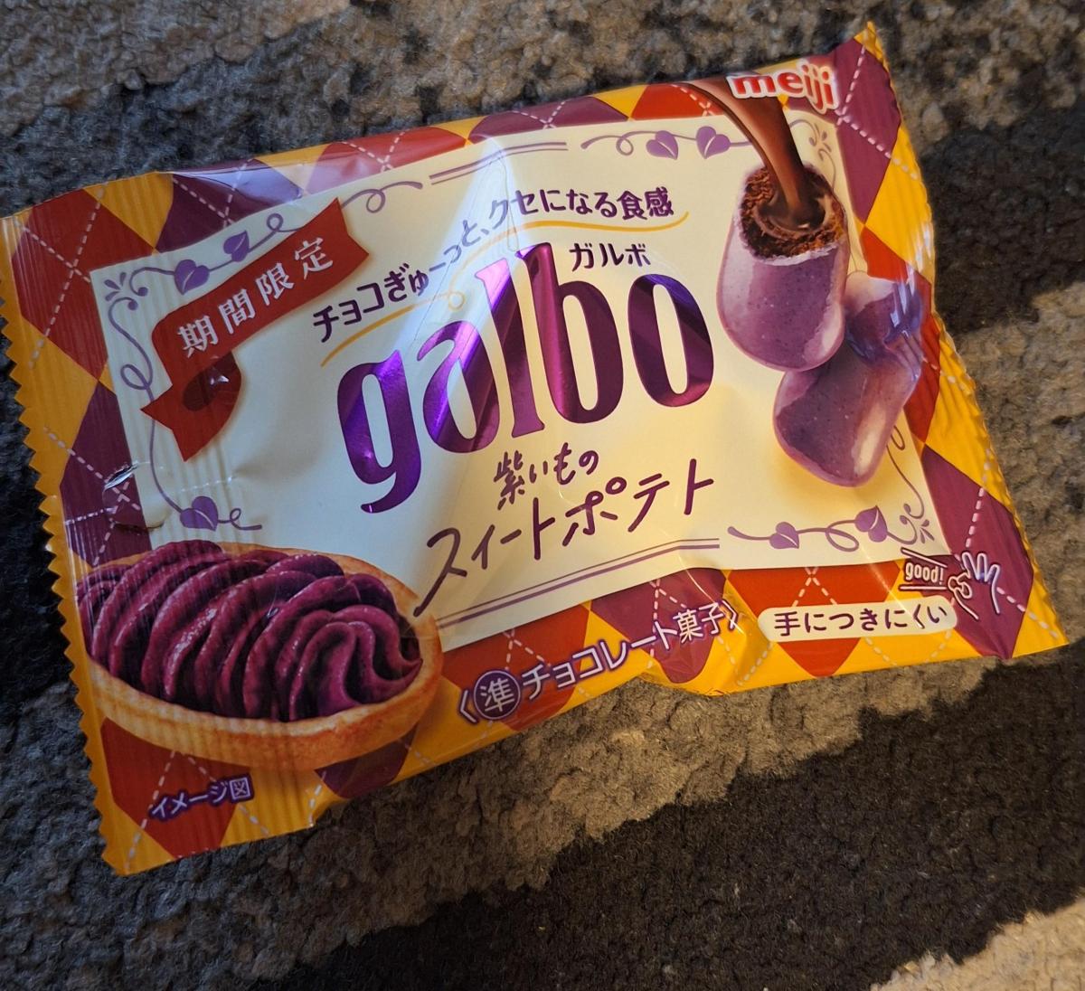 ガルボの新味を楽しみにしていました。ガルボはチョコの表面がつるつるとしていて、噛むとシャリシャリとした食感です。味は紫いものスイートポテトということで、紫いも特有のまろやかで甘い香りがして、思っているスイートポテトの風味とは違います。黄色いさつまいもでも作ってみてほしいです。