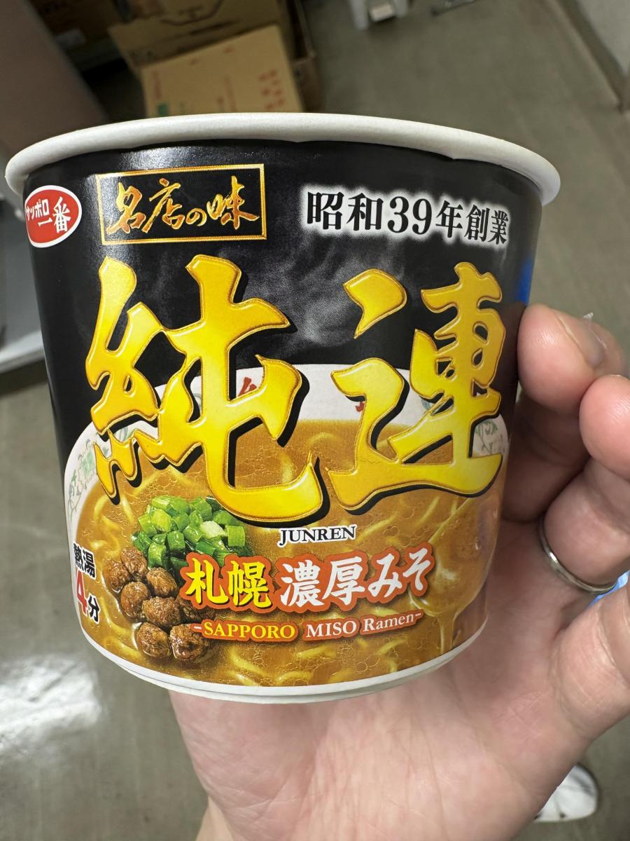札幌の濃厚みそラーメンとして有名な純連のカップ麺です。ラードもいっぱい、名店ラーメン屋を味わえます。昭和39年創業純連!