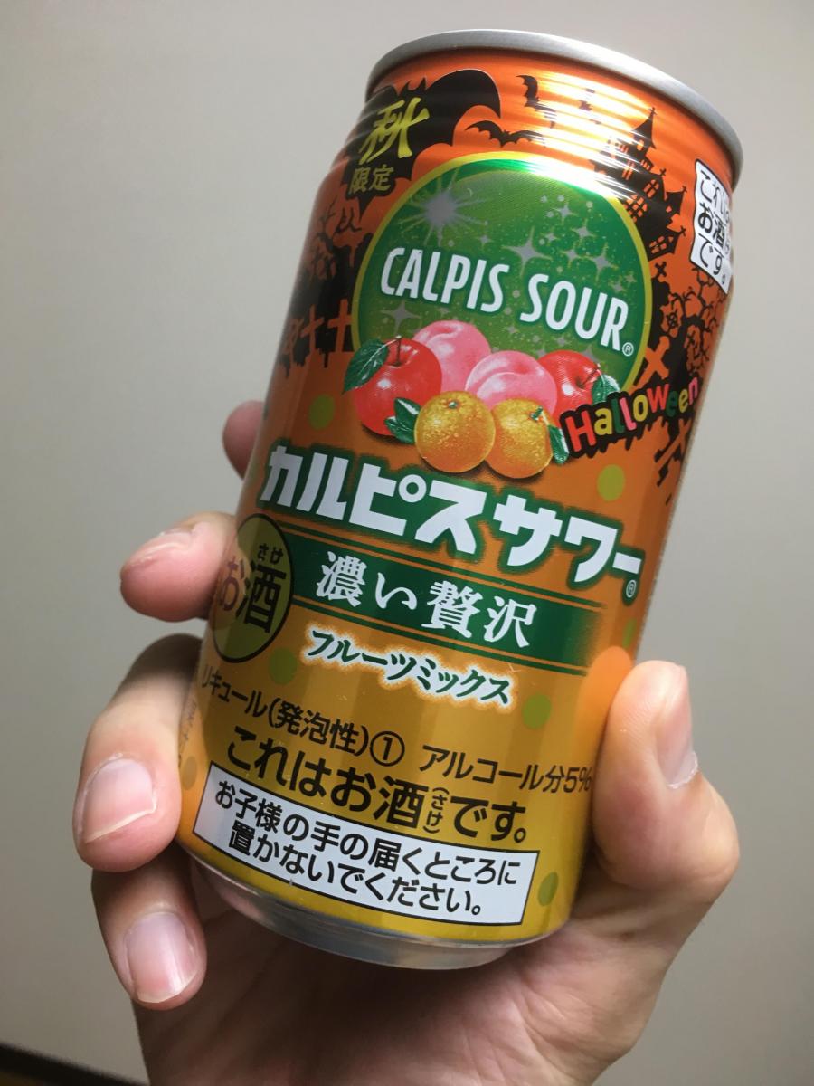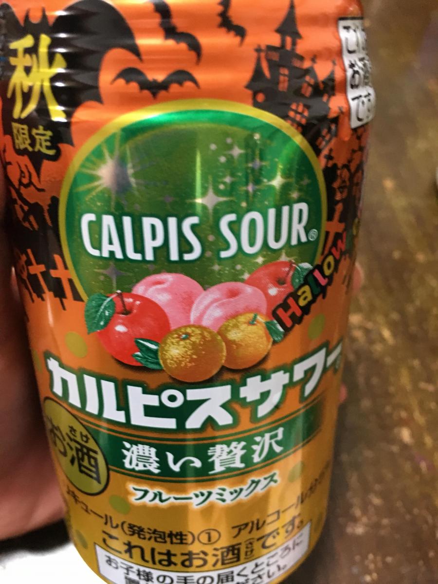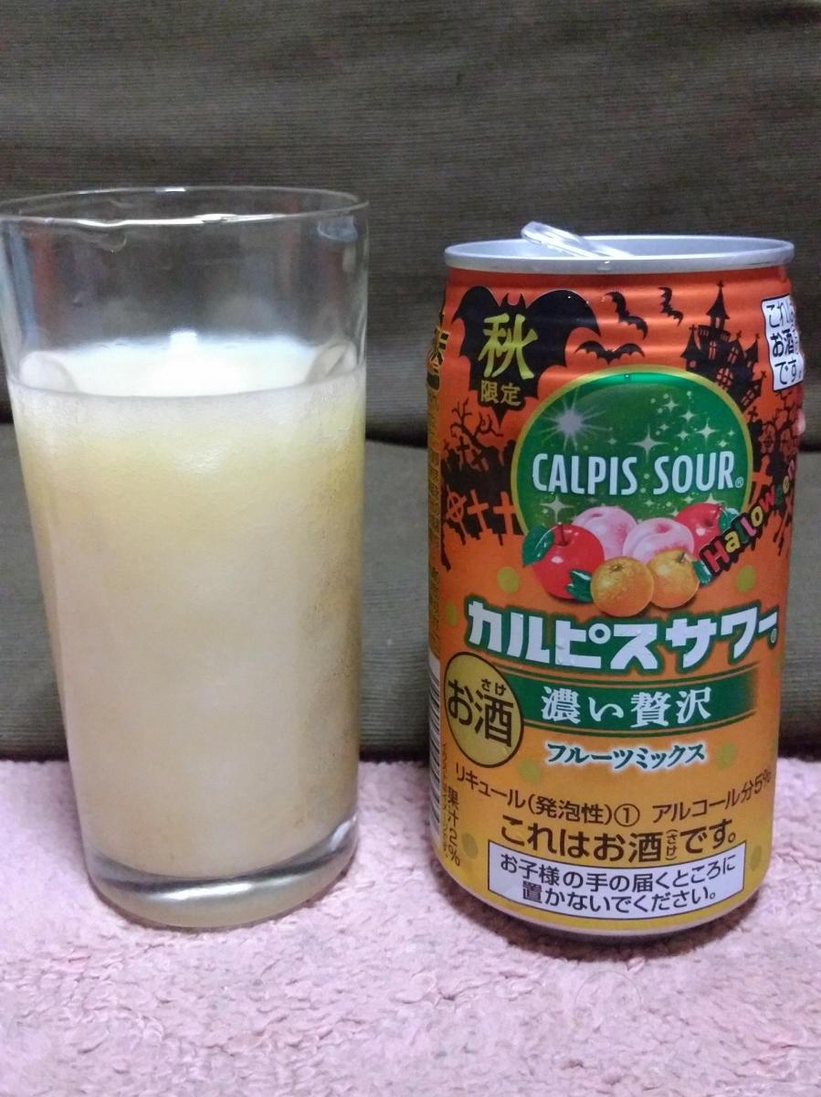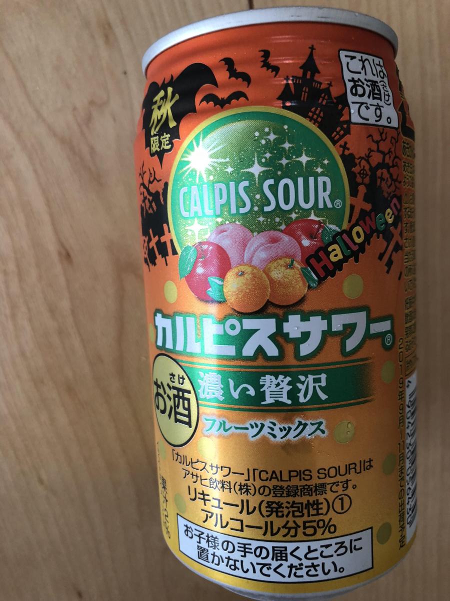 ミックスジュースのような味わいのカルピスサワーで甘くて果汁の味わいです。サワーなので甘ったるいという感じはぜず果汁の後味が爽やかです。ハロウィンのような外観デザインも可愛いですね。