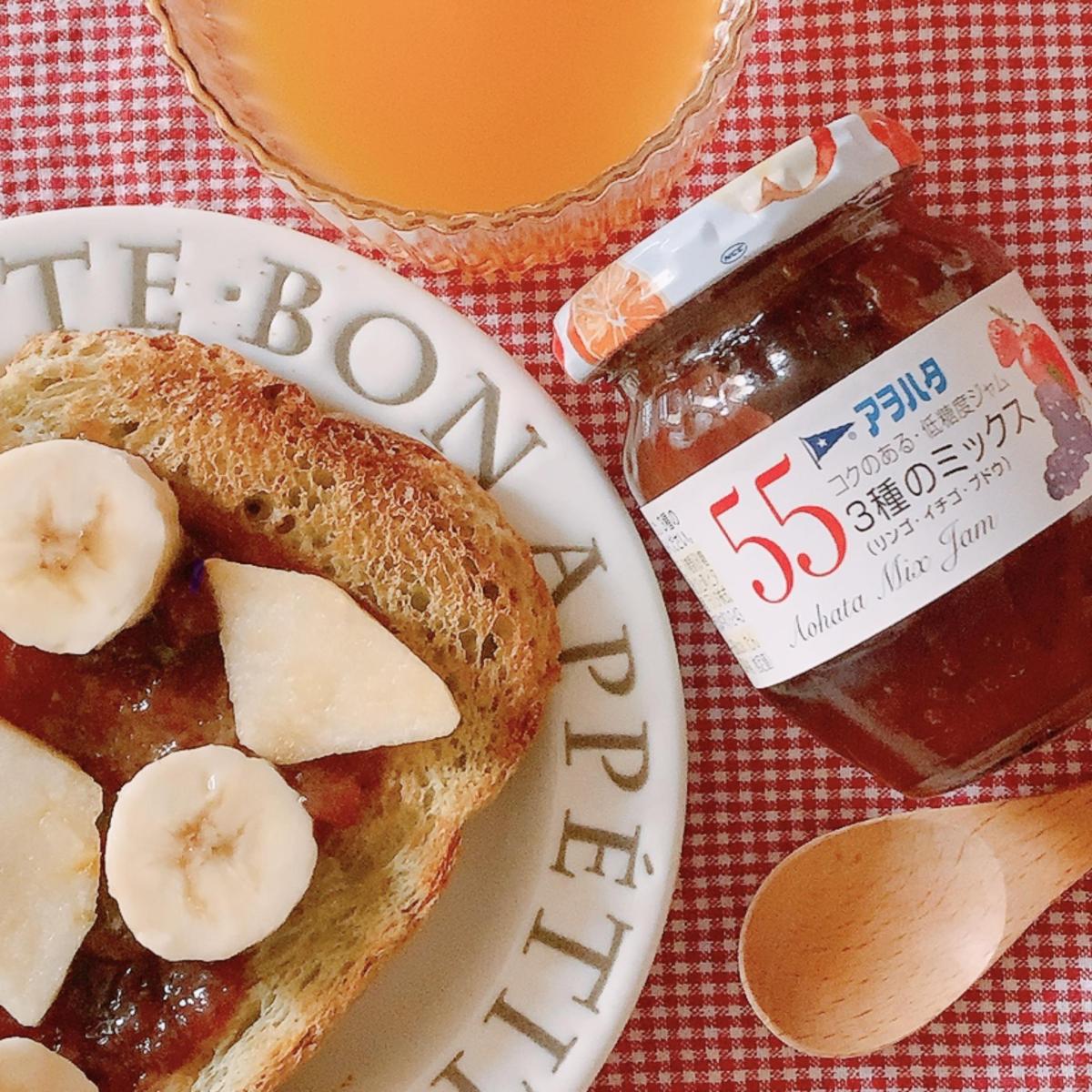 朝食にパンが多いので、ジャムは欠かせません。アヲハタのジャムは色々な種類があっていつも迷ってしまいます。3種のミックスはリンゴとイチゴとブドウでとっても爽やかな風味です。色もきれいですね。所々に入っている果実はリンゴで食感が良かったです。美味しい朝食で気持ちいい朝のスタートになりました。