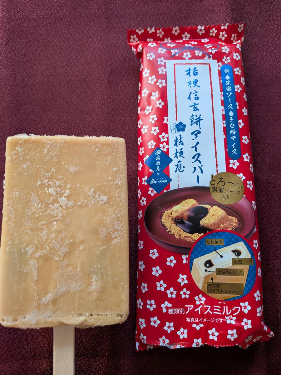 桔梗信玄餅をイメージしたパッケージにワクワクします。きなこ味のアイスキャンディーの中に、もち菓子、黒蜜ソース、きなこアイスが入ったこちらの商品。