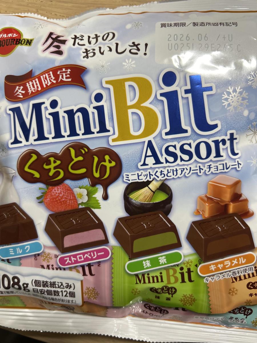 ミニビットは好きで何度も食べていますが、こちらの「くちどけアソート」は本当にくちどけがいいです。中のクリームがとても滑らかで贅沢な気分になります。ミルク、抹茶、ストロベリー、キャラメルと4種類の味がありますが、どれもハズレはありません。どれもとてもおいしいので、袋の中に手を入れて何味が出てくるのか毎回楽しみになります。