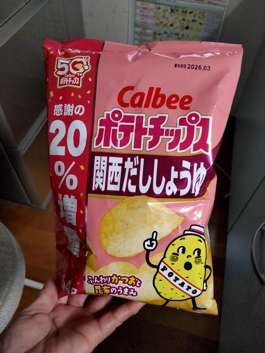 カルビーのポテトチップスの限定販売品です。カツオの出汁が微かに効いたちょっと甘みあるしょうゆが上手くポテチに活かされていて、クセになる味わいです。