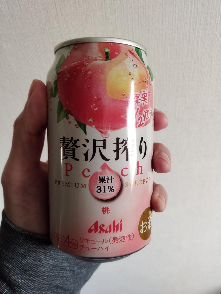 桃の果汁入り酎ハイとは驚きで飲んでみました。果汁感はすごいですがアルコール4%と低いので桃のジュースを飲んでいる感覚でぐいぐい飲めてしました。お酒の弱い人にはジュース感覚で飲めるのでよいではないでしょうか。