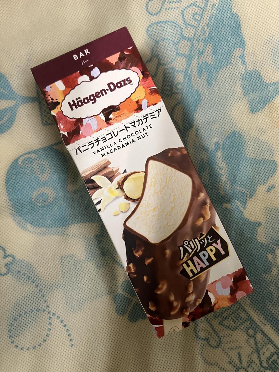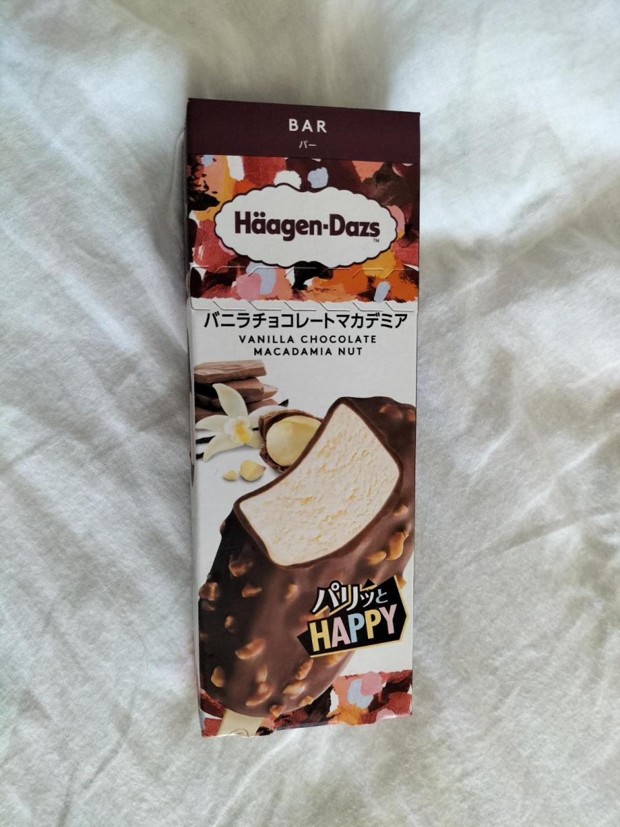 ハーゲンダッツのバータイプ。バニラチョコレート マカダミア。カップタイプが好きでバータイプはあまり食べたことないですがマカダミアナッツの香ばしさとチョコレートのコーティングのパリパリが美味しいです。バニラか甘く感じます。