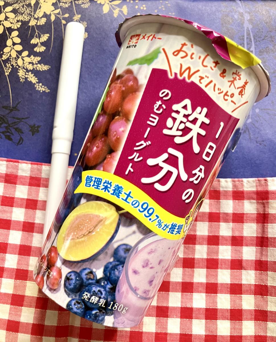 ドラッグストアで、パープルカラーの華やかなカップの飲むヨーグルトを見つけて買ってみました。鉄分も最近あまり摂れてない気がしたので、丁度いいなと思いました。