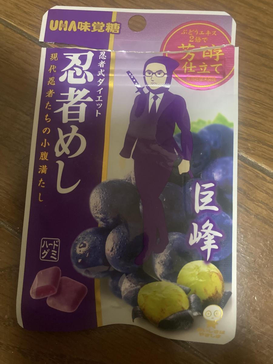 シュールな、スーツ姿の忍者が特徴的なこちらのグミ、ひとつは小さいですが、固めで結構食べ応えあります!!グレープ味でしたが、甘酸っぱいぶどうの味がちゃんとして美味しかったです。こちら、一袋食べてもカロリー100以下!なのでダイエットにもとてもいいなあと思いました。また小腹がすいてグミが食べたいとき、でも罪悪感を感じたくないとき笑、ぜひリピートしたいです!!
