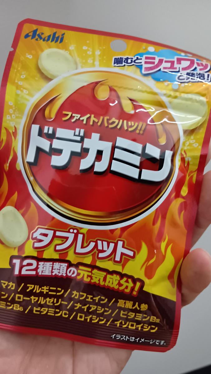 平たい大粒でカリッと固めのタブレット。噛むとシュワッと炭酸が溢れる感じ。固めの食感が良い。しっかりドデカミンのエナドリ味がするけど爽やかな後味でクセになるし止まらなくなるおいしさ。タブレットだけどマカ・アルギニン・カフェイン・高麗人参・ローヤルゼリー・ナイアシン・ビタミンB₂・ビタミンB₆・ビタミンC・ロイシン・イソロイシン・バリンの12種の成分入りで、手軽に元気をチャージできる。ジッパー付きだし手軽に買えてうれしい。