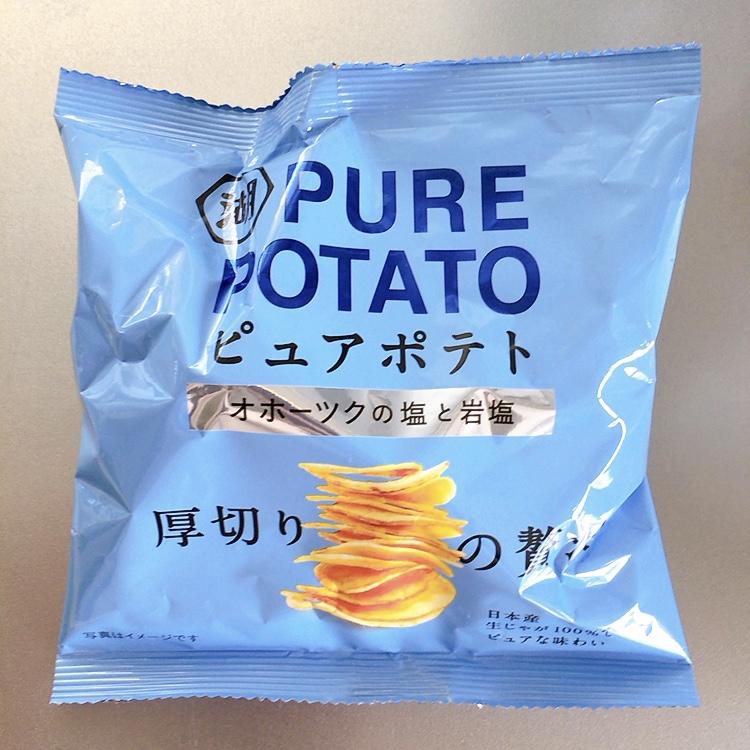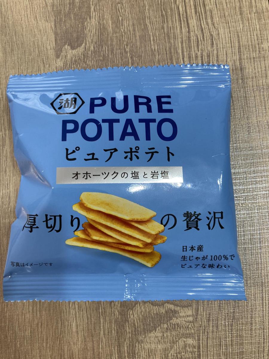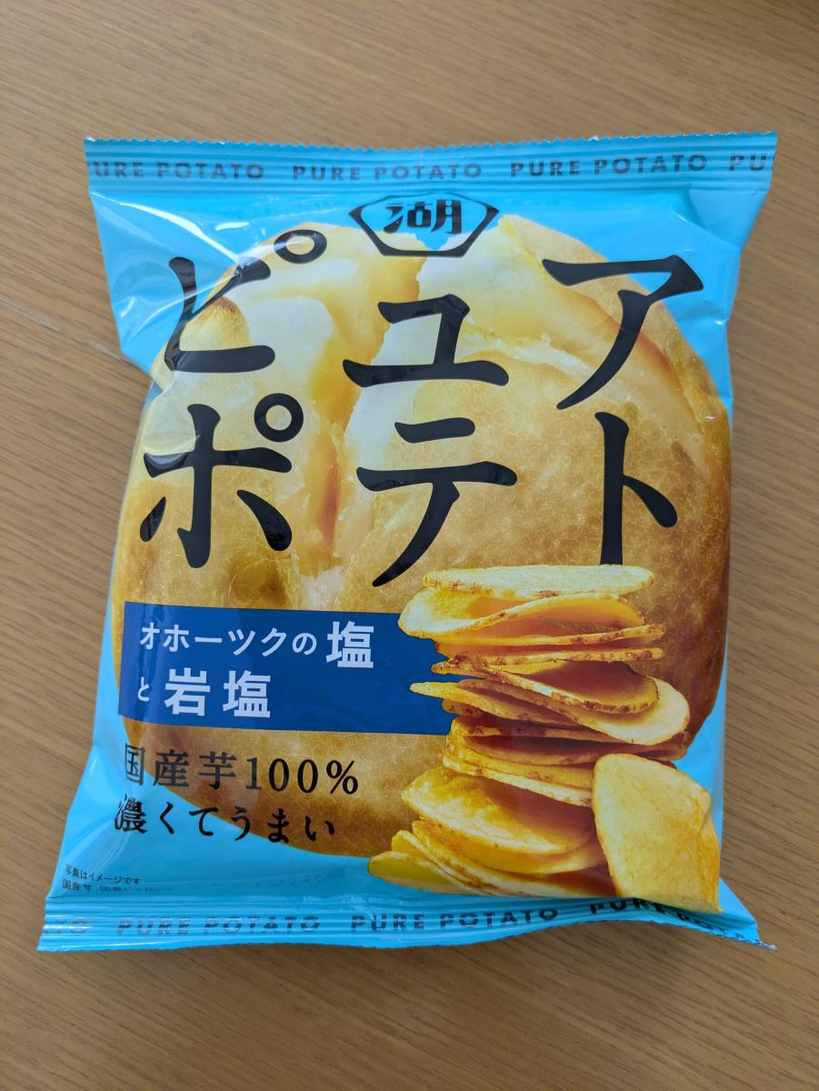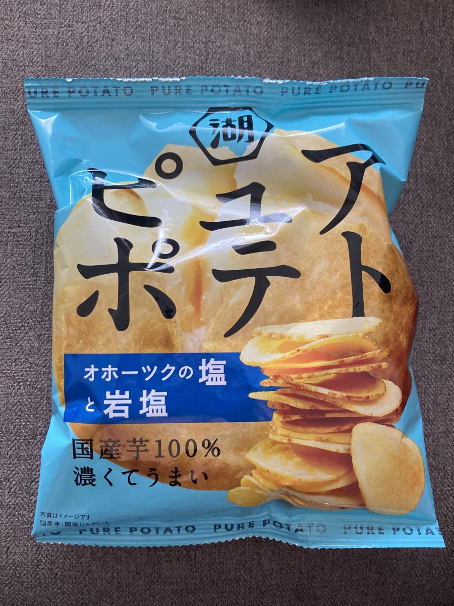 CMに惹かれて購入しでみた湖池屋ピュアポテト オホーツクの塩と岩塩。ポテトは厚切りで食べ応えがあってしっかり旨みを感じました。オホーツクの塩と岩塩味は塩感強めで自分好みで国産芋100%も嬉しいポイントです。満足感高めでゆっくりと食べたいポテトチップスです。美味しいです。