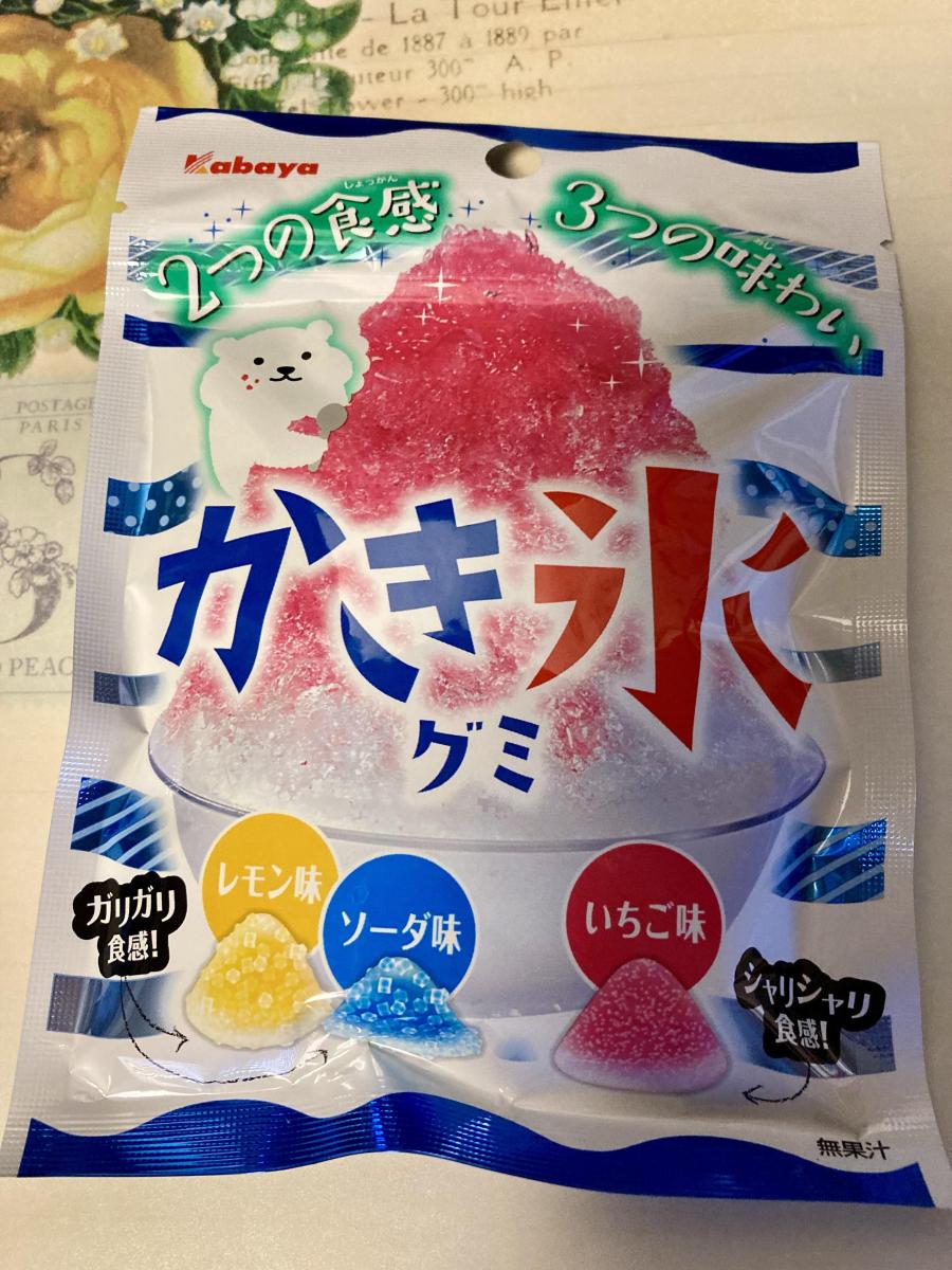 かき氷に見立てた形のグミが3色、レモンとソーダといちごが入っています。周りは氷の雰囲気を出したシャリシャリ食感、爽やかな感じです。グミ自体は少しハードでかみごたえがあります。よくあるグミの味ですが、見た目が可愛らしいですしこれからの季節にぴったりだと思います。