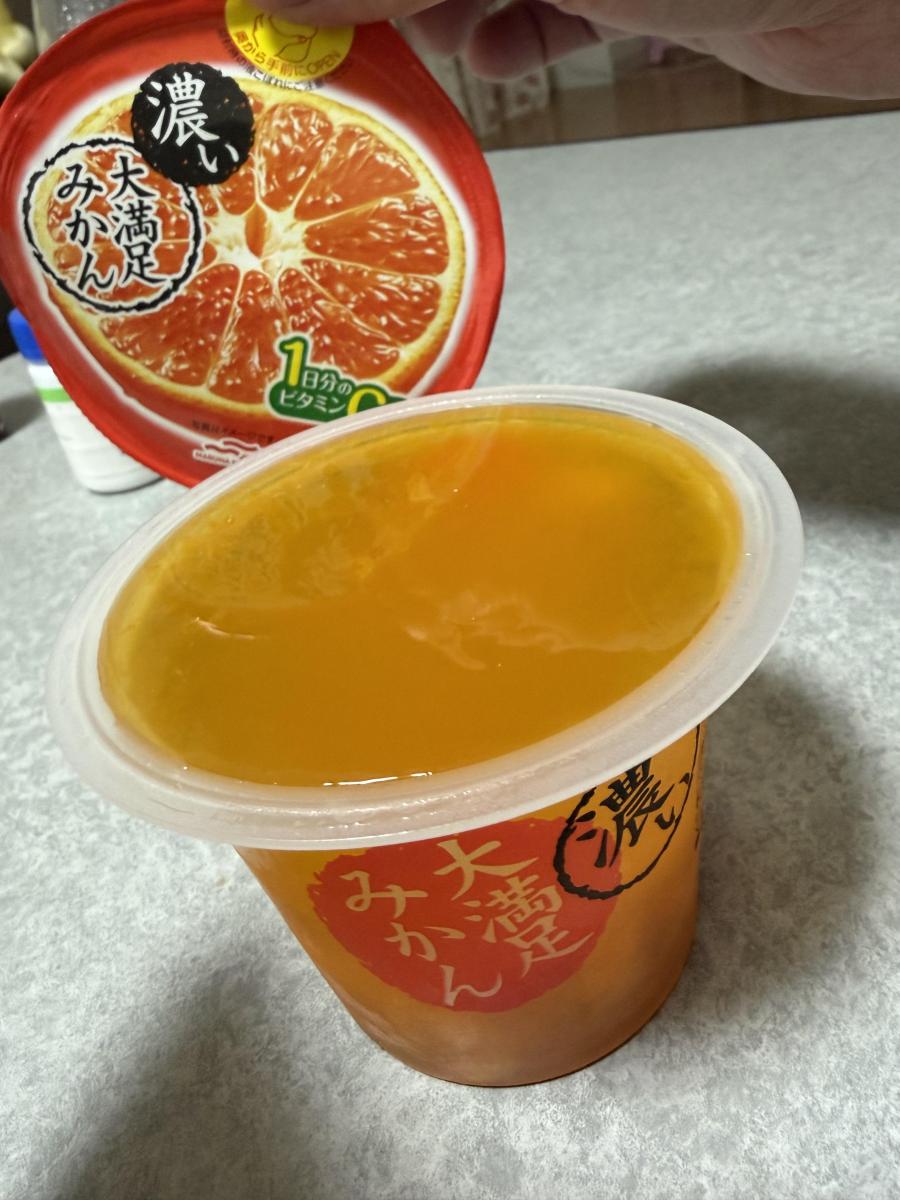 ゼリーまでみかんジュースのような味。1日分のビタミンC入り酸味もしっかりある。つるんっと程よい柔らかめのゼリー。みかん果肉はジューシーでみずみずしく、285gの大容量で食べ応えすごい。普通の大満足みかんとは別物だけど、濃い方が好みだった。