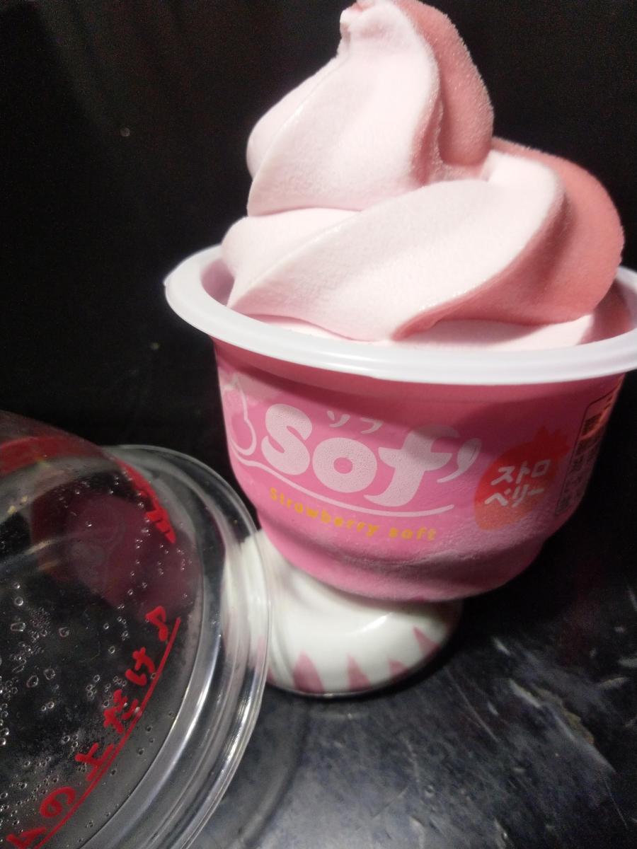 年齢重ねてもストロベリー&ピンクの色は心ひかれます。思わず可愛いな〜と手に取り購入しました。ソフトクリームの上だけというのも何か面白い。時々コーン付きを買ったりしますが、最初から割れてたり、食べてる時にポロポロしてしまったりするのでクリームだけというのは嬉しいです。最初に濃いピンクのところを食べてみたら、イチゴの味がしっかり濃いめでびっくり。シャリっとしたジェラートのような感じで後味スッキリ。薄いピンクのところはクリーミーで優しいストロベリーの味です。別々に食べても美味しいんですが、2種類が合わさっているところもかなり美味しいです。甘過ぎずさっぱり食べれます。安っぽい味かな?と期待はしてなかったんですが、想像以上にイチゴか濃厚で美味しかったです。また買ってみようと思います!