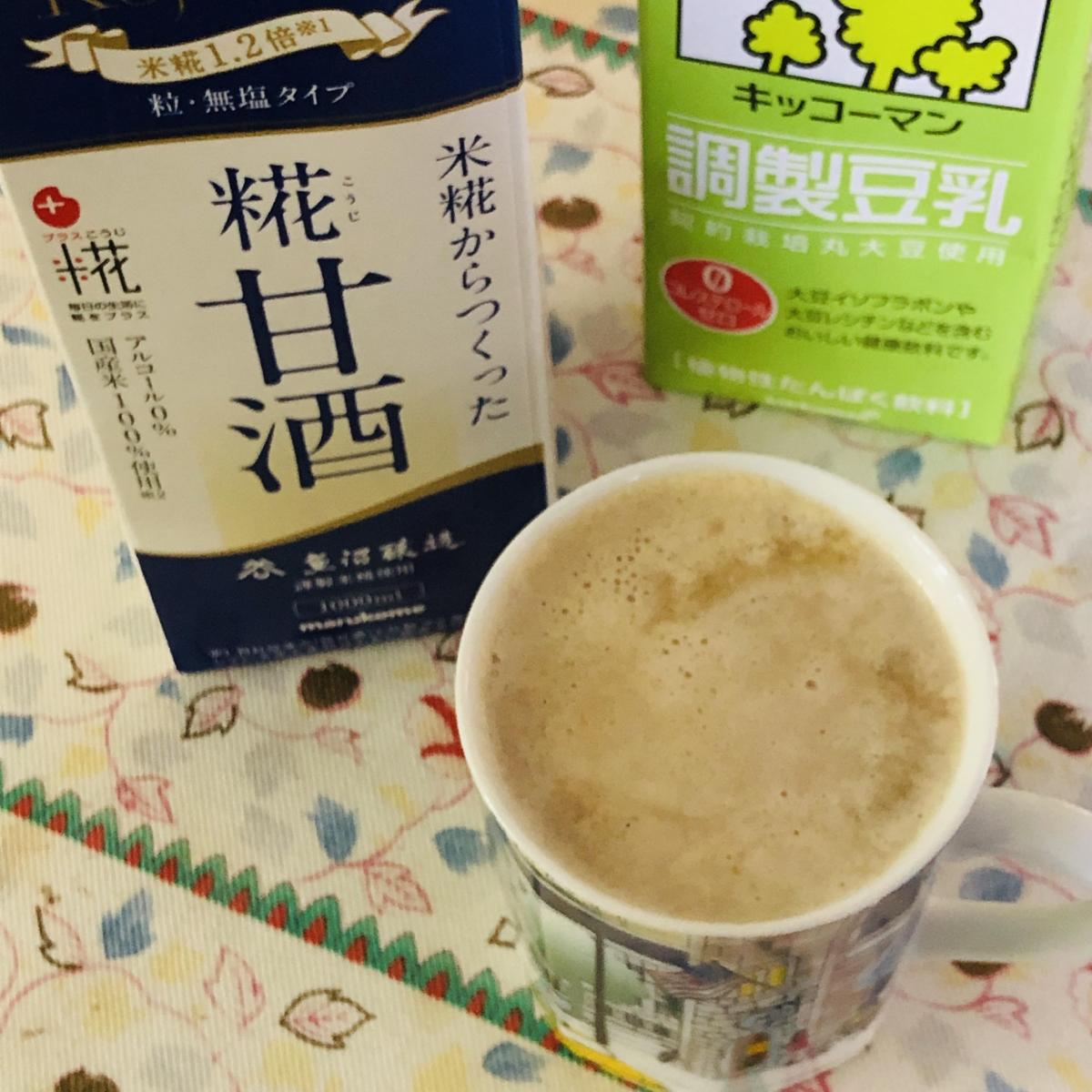 麹の甘酒なので、アルコールフリーです。麹のやさしい甘味で、そのまま飲んでも十分おいしいですが、豆乳で少し割って、おろし生姜を加えて電子レンジ加熱をすると、体がとっても温まります。寒い時の定番になっています。
