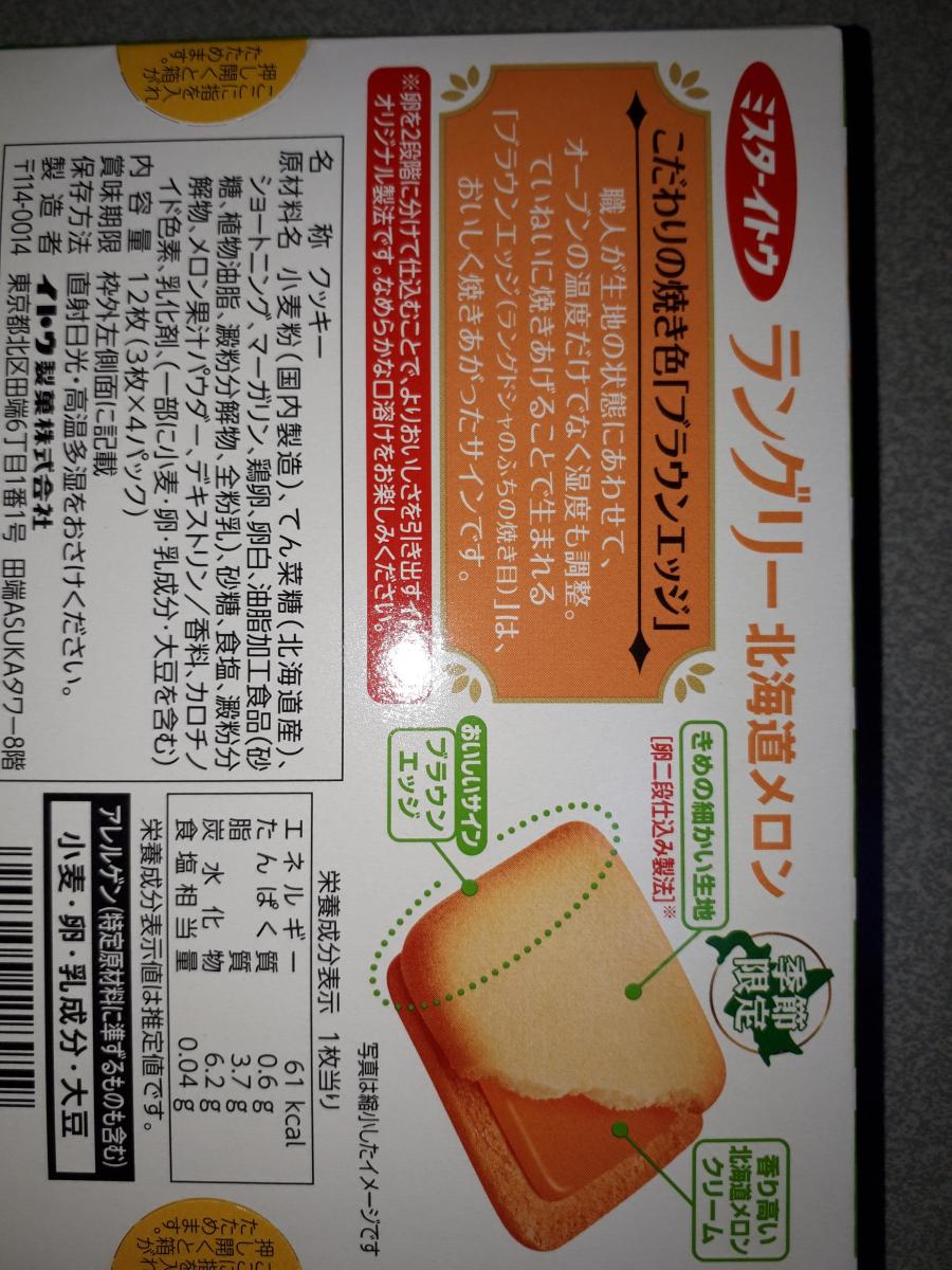 ミスターイトウのラングリーは独特の食感と高級感が大好きでドラッグストアで見かけるとつい買ってしまいますね。この北海道メロンはメロン味の再現度が見事です。なかなかお菓子でここまで本物っぽいメロン味は出せません。すごいです。