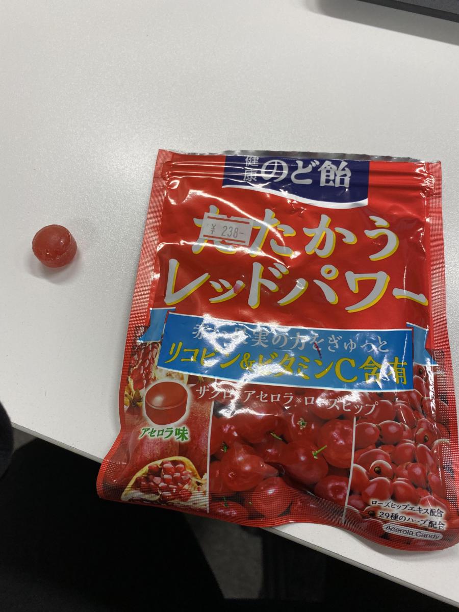 今時珍しく個包装されていない裸の飴が大きな袋に入っているタイプのキャンディーです。最初は湿気でダメになってしまうのではないかと失敗した気持ちになったのですが、意外にそのような問題は起きませんでした。味も結構すっきりとした酸味のあるアセロラ風味であり、美味しかったです。ただやっぱり個包装されているキャンディーのほうがいいなぁと思うのは正直な気持ちとしてあります。味は問題ないのですがこの形にするメリットは何かあったのでしょうかね。