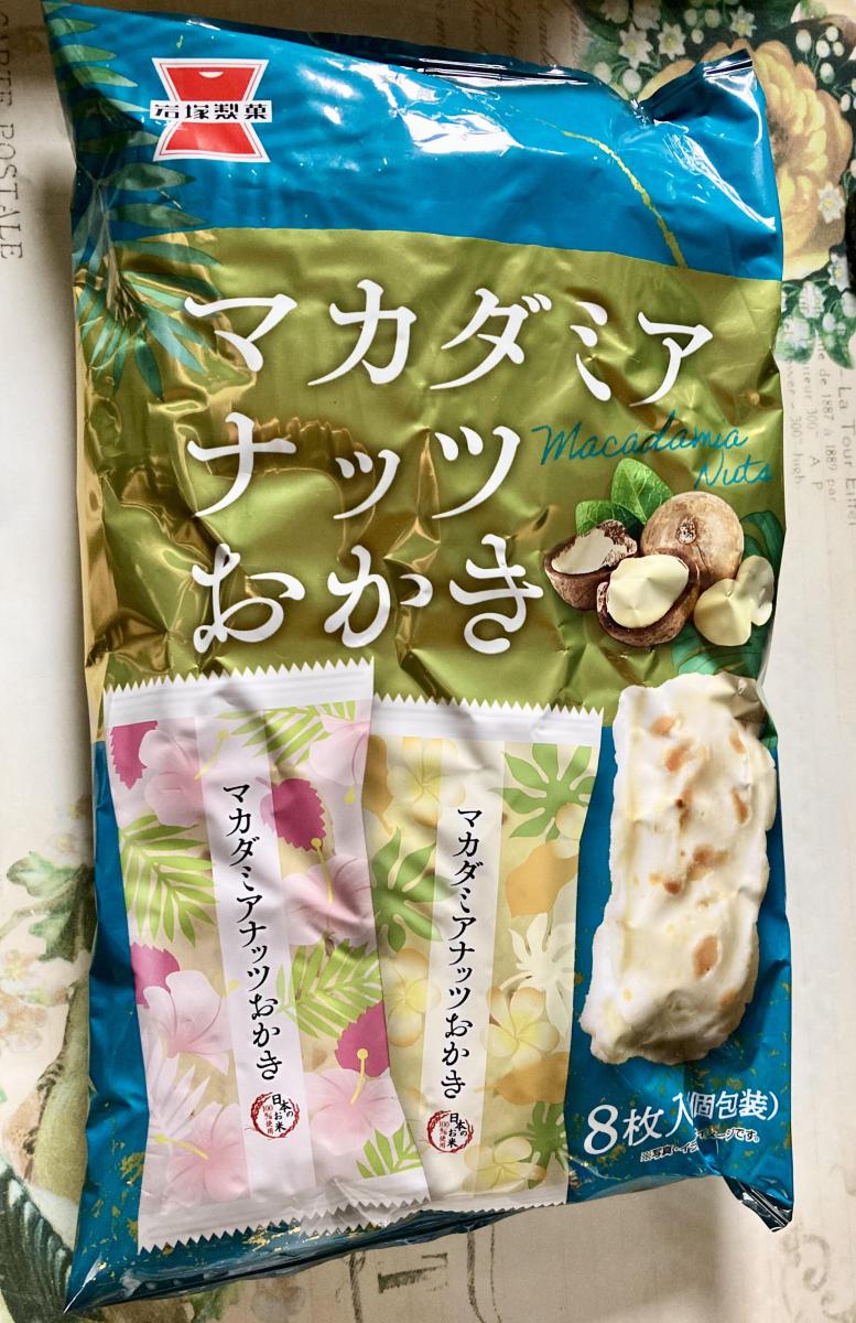 岩塚製菓のマカダミアナッツおかきです。外はサクッと軽い歯ごたえ、中はふんわり、そしてマカダミアナッツの甘みが心地よいです。