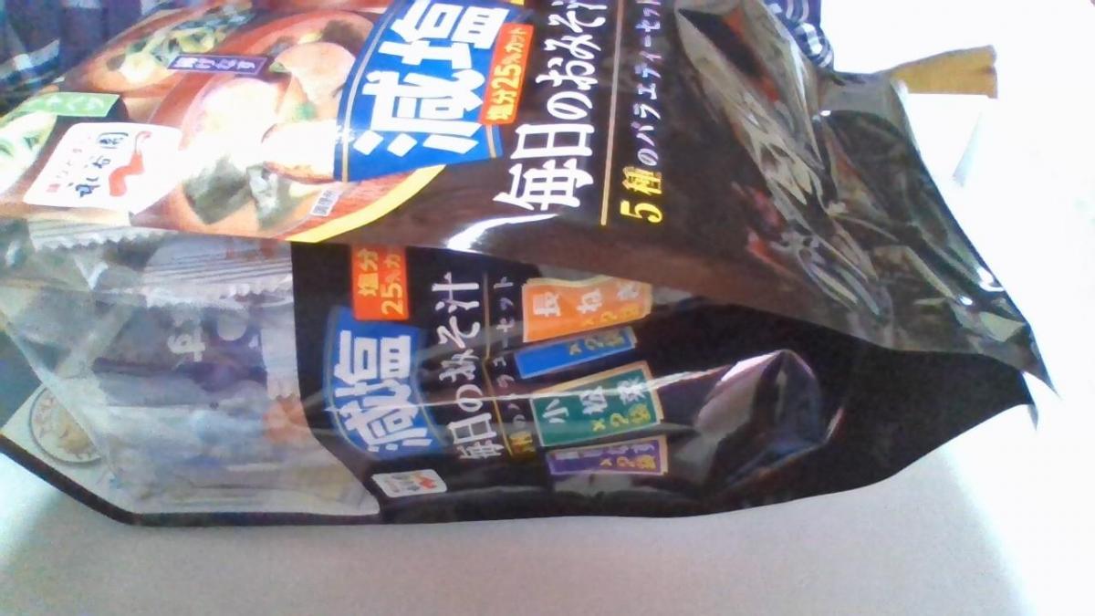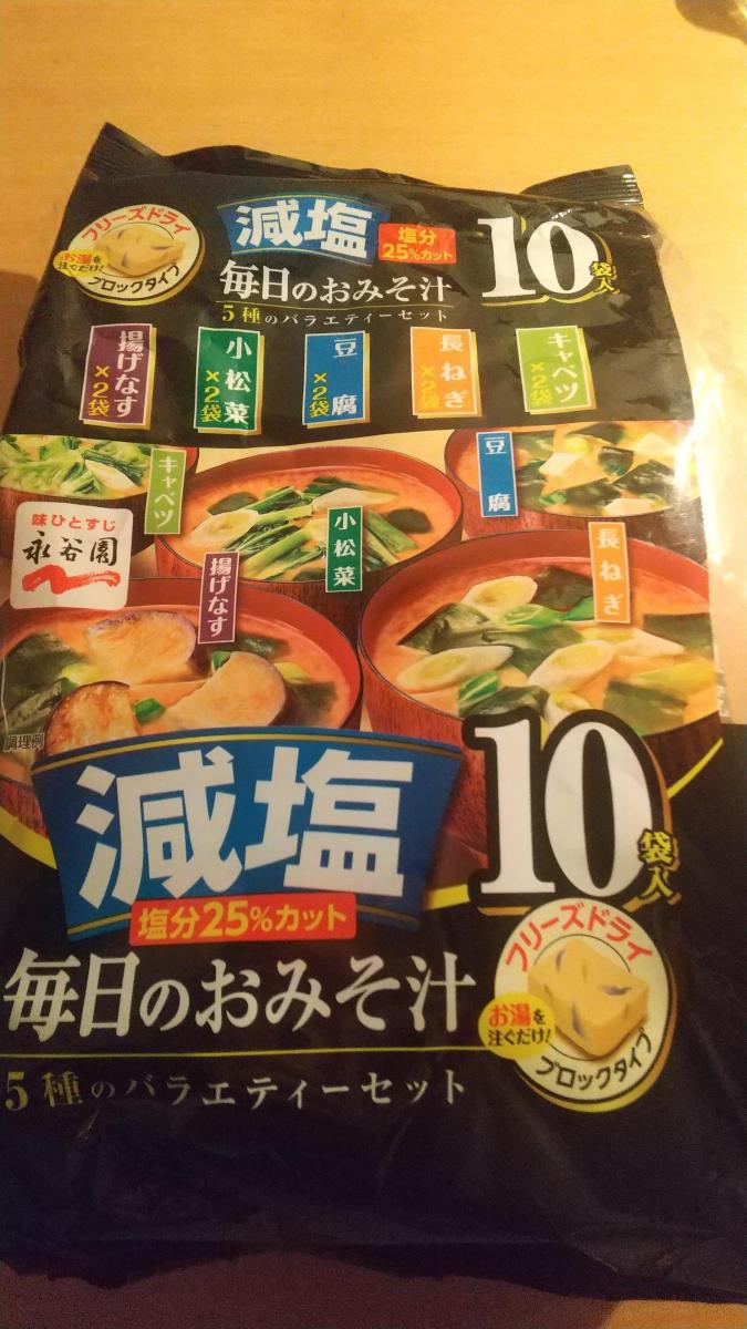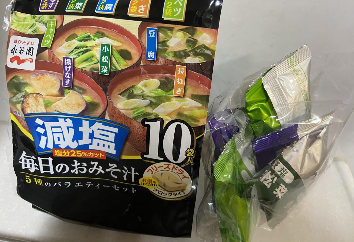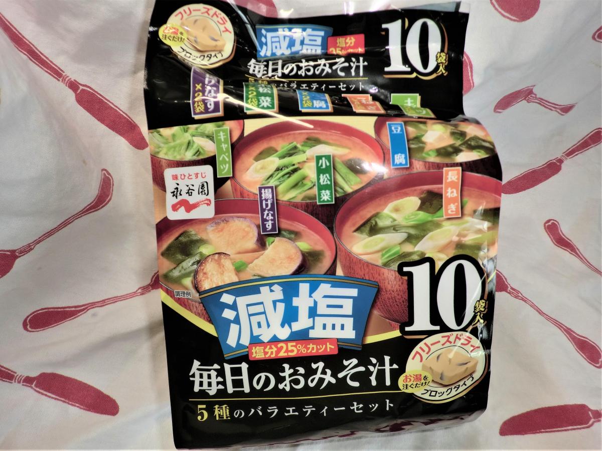 夏場は味噌汁が傷みやすいのでインスタントを使う頻度が高まりますね。今回は永谷園のバラエティ減塩タイプ。フリーズドライ。