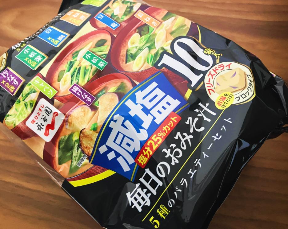塩分が25%もカットされてる減塩タイプのフリーズドライ味噌汁です。フリーズドライはお湯を注ぐだけでできちゃうので、鍋で味噌汁作る必要がないし夕飯の手間が省けて助かっています。