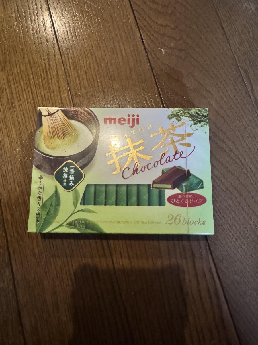 明治の抹茶チョコレートをいただきました。一口サイズで食べやすく、このシリーズは苺チョコもお気に入りですが、抹茶もとても美味しいです。中の抹茶チョコを外側のミルクチョコが優しく包み、バランスの良い味わい。抹茶は嫌な苦味がなく、ほんのり香る風味が心地よく、甘さとの相性も抜群です。抹茶好きはもちろん、甘いチョコが好きな方にもおすすめできる一品で、気軽に楽しめるご褒美チョコレートだと思いました。