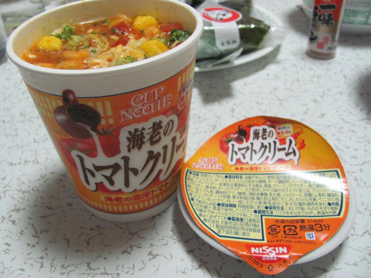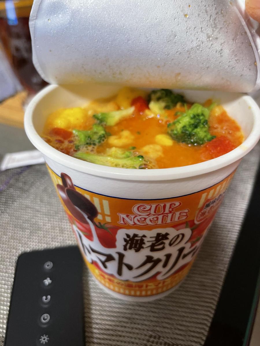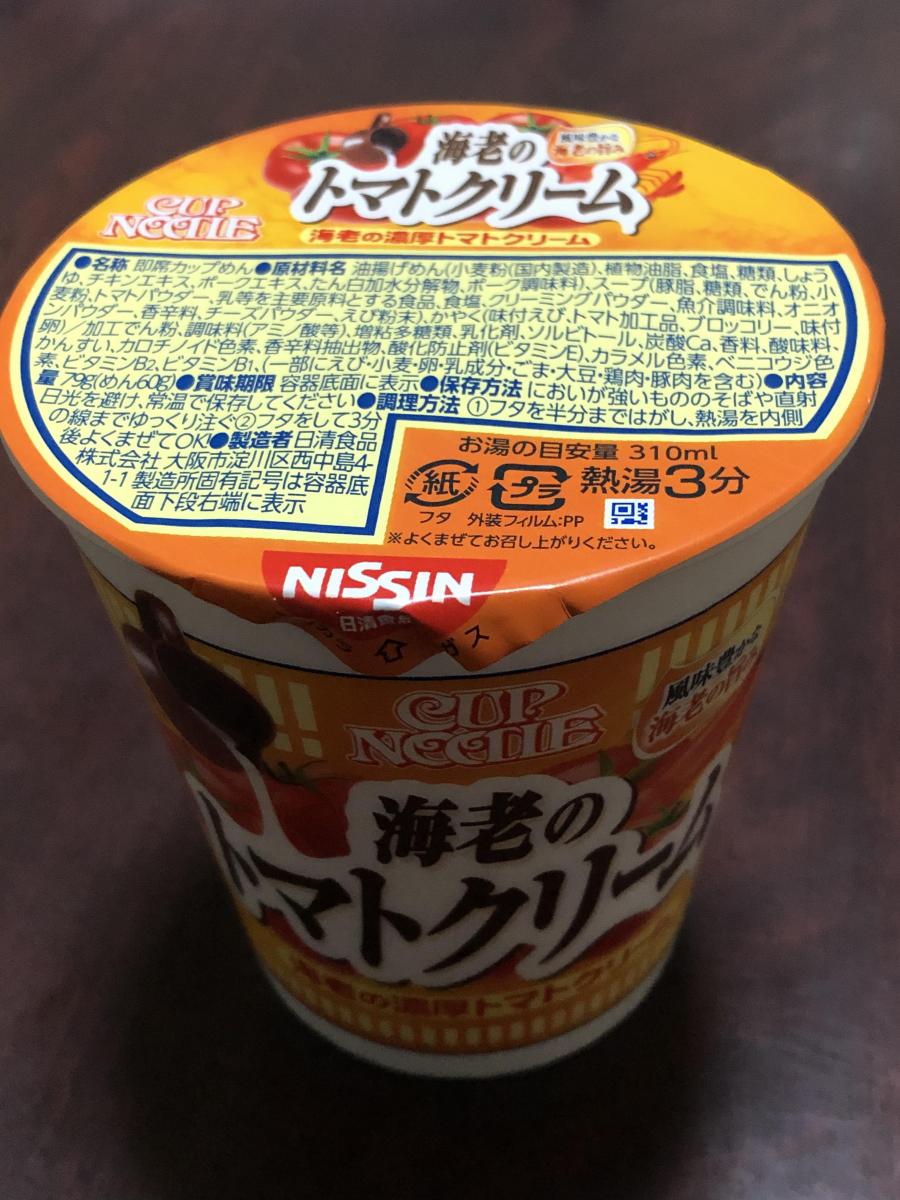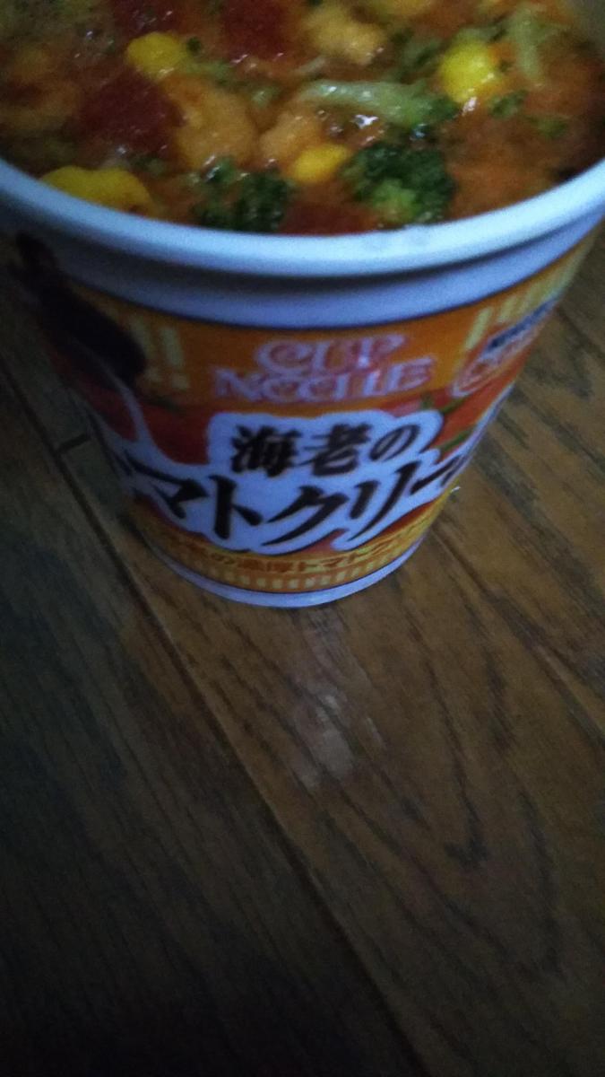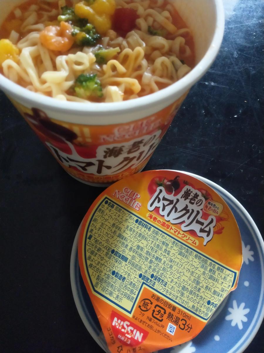 エビとトマトとクリーム、好きな組み合わせです。お湯を入れたらいい香りがして期待が高まりましたがちょっと思ってたのと違いました。エビもトマトもクリームまあんまりガツンとこない。ちょっと酸味のあるとろっとしたスープのカップヌードル。ちょっとしょっぱい。美味しくないことはないけど。また、食べたい感じでもない。