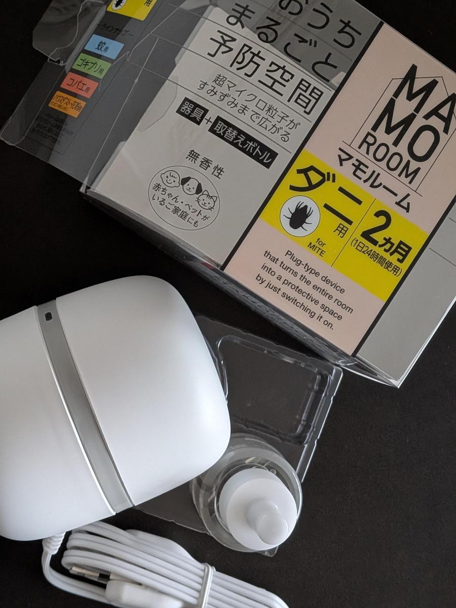マモルーム ダニ対策用。お部屋まるごと予防空間という空気中に薬剤拡散して防虫対策するもの。部分的な防虫では不安な部屋に買ってみました。白いころんとした形はかわいく、マモルームシリーズは派手さがないシンプルデザインがとても気に入っています。