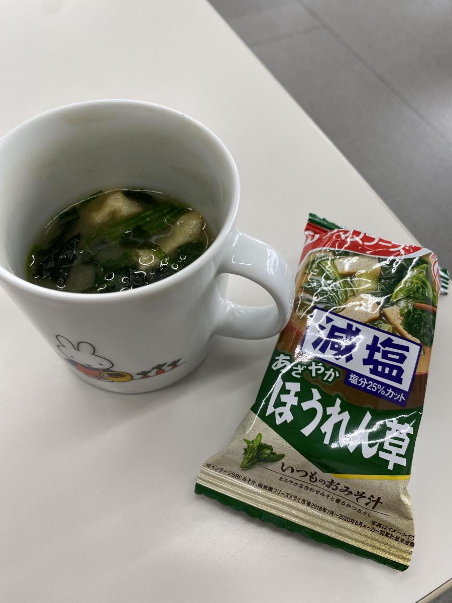 お湯を注ぐだけでいいので、便利です。減塩なので薄味でした。具はほうれん草に刻みあげ,ネギ、ワカメが入っていました。ほうれん草の味はかすかにしていました。印象はあげの主張が強かったように思います。