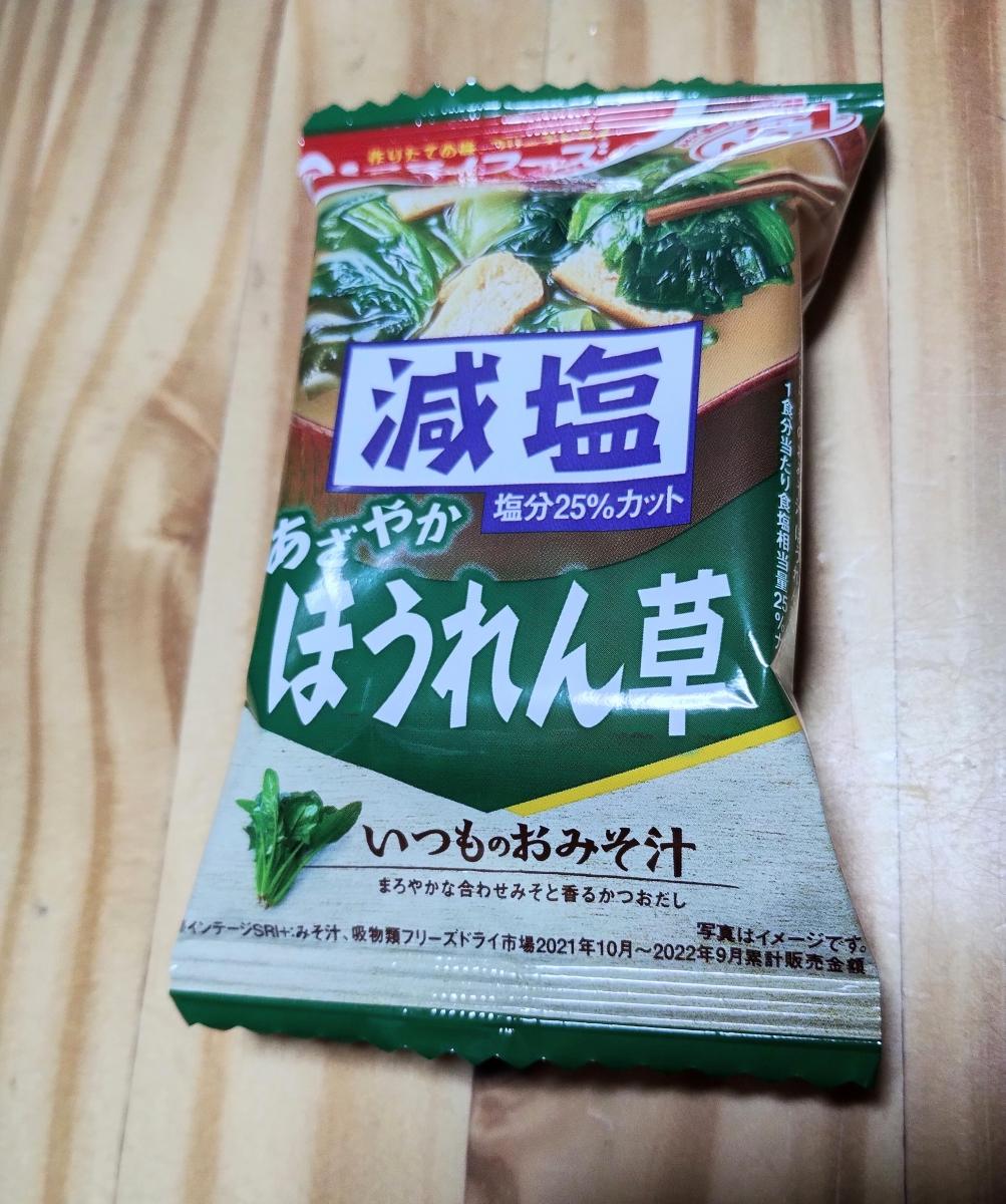 ほうれん草がいっぱい入っているけれど、わかめも入っているので、ほうれん草が全てわかめのように思えてしまいます。わかめはいらなかったかなぁ。油揚げは噛みごたえがあり、ほうれん草より目立っています。味噌はコクがあるが減塩なので塩気は抑えめです。