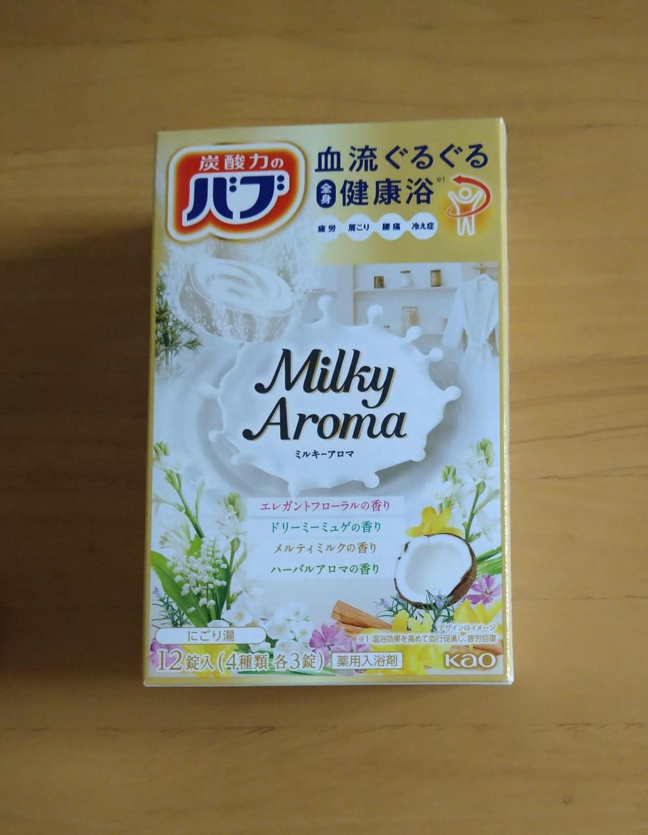 バブのミルキーアロマは乳白色のお湯にとても優雅な気分になりアロマの香りにいやされています。