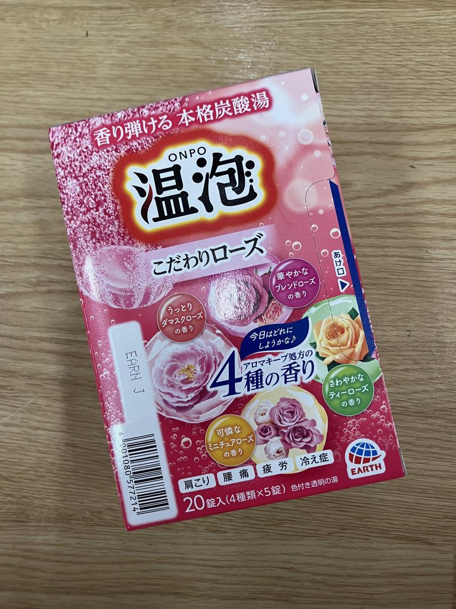 温泡のシリーズ。いろんな種類があってとっても楽しいです。炭酸湯なのでしゅわしゅわするのも楽しいですし、疲れがより取れる感じがします。こちらはこだわりローズということでローズの炭酸湯です。華やかな香りがとってもいいですね。