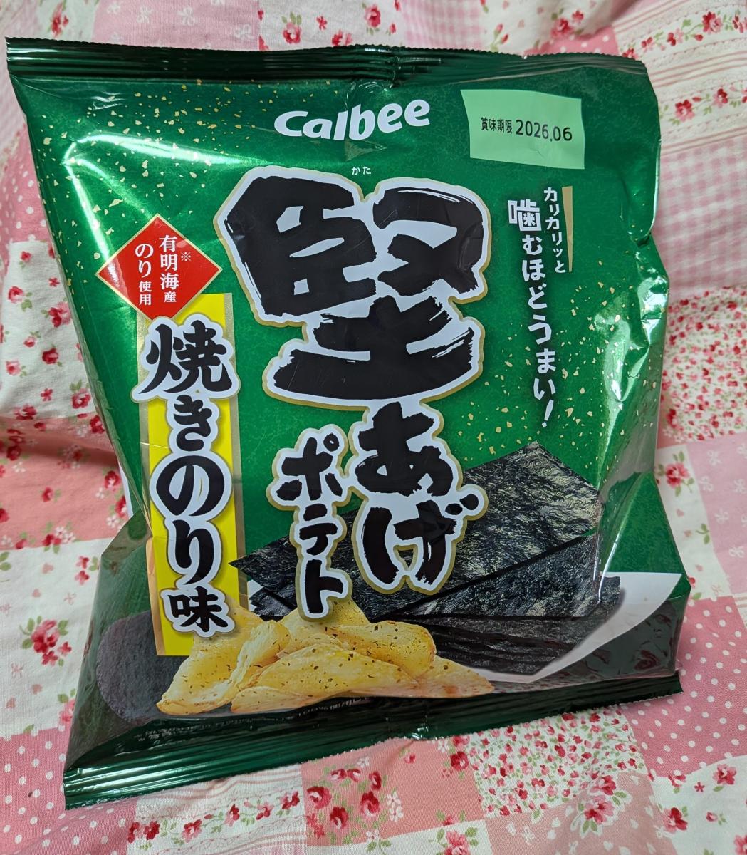 堅あげポテトは、焼きのり味とあります。カリカリとした、歯応えのチップスに、焼きのりの味が乗っかって、おいしいです。