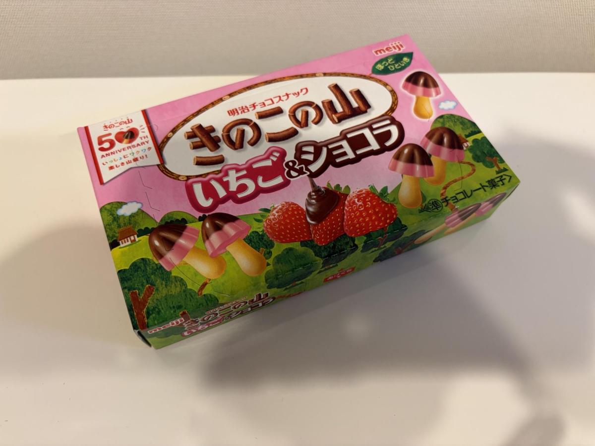 大好きなきのこの山の、イチゴ味にてっぺんの方はチョコ掛け風なビジュアルです。組み合わせ的にも間違いない味だと思いますが、食べるタイミングによっては、ちょっと甘さや風味濃いめかな。